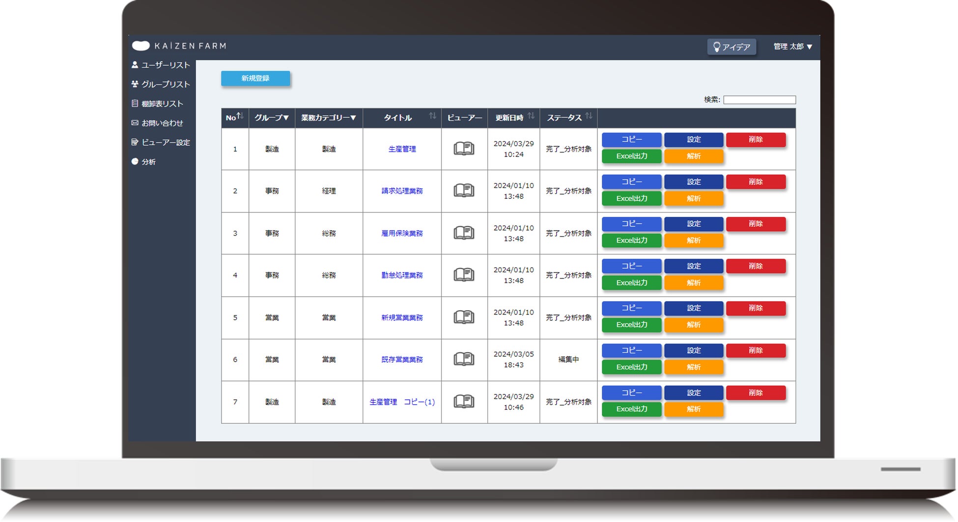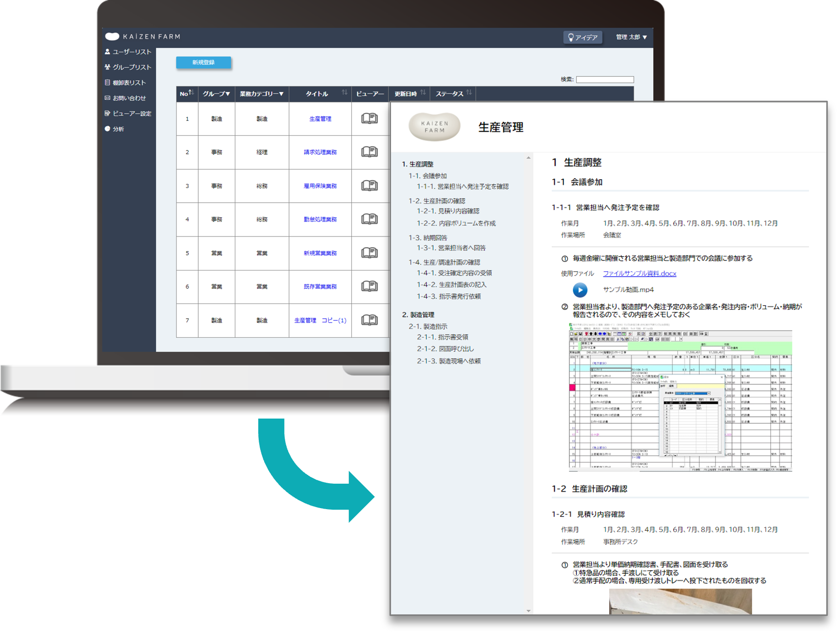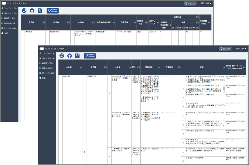 KAIZEN FARMはクラウド型業務改善支援ツールです。業務の整理・分析・改善・定着を一気通貫でスムーズ化し、業務改善の第一歩をサポートします。