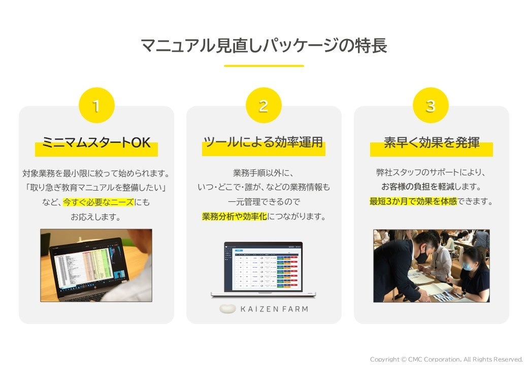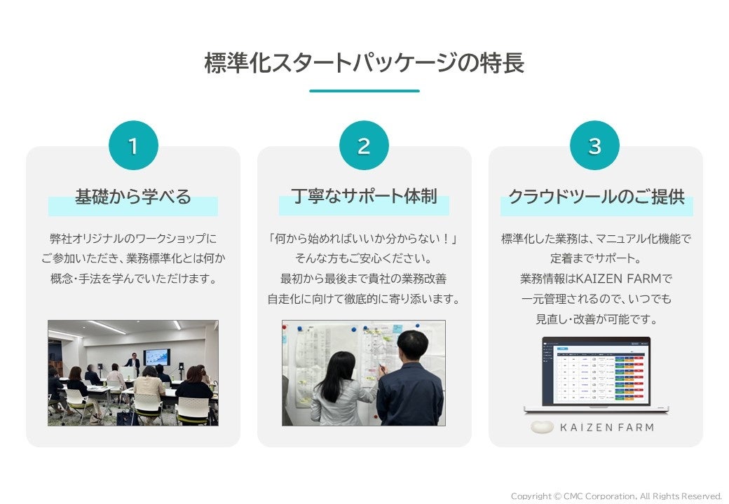 株式会社シイエム・シイ(本社:愛知県名古屋市、代表:佐々 幸恭)は、2025年3月12日(水)に自社開発のクラウド型業務改善支援ツール“KAIZEN FARM”と、同社が得意とする業務標準化の伴走支援を掛け合わせたサービス【KAIZEN伴走LABO】の提供を開始しました。