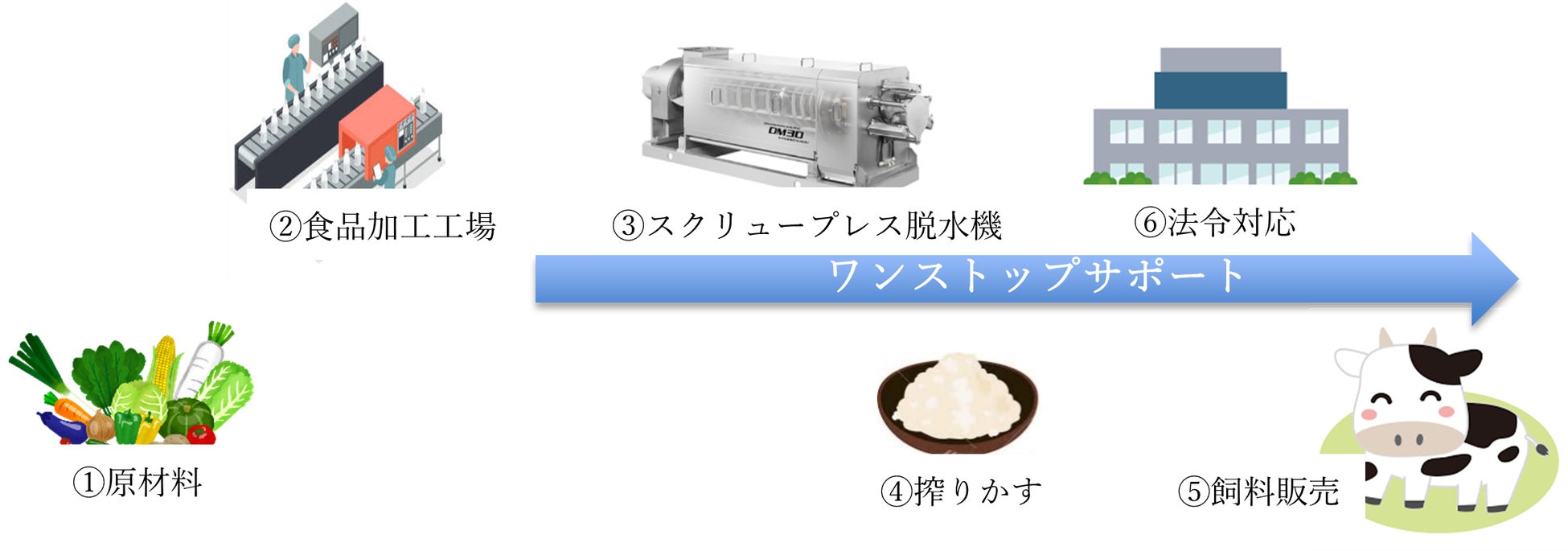 当機での脱水後は飼料へのリサイクルが可能。『当局申請から販路の確立まで』を同社がワンストップでサポートします。