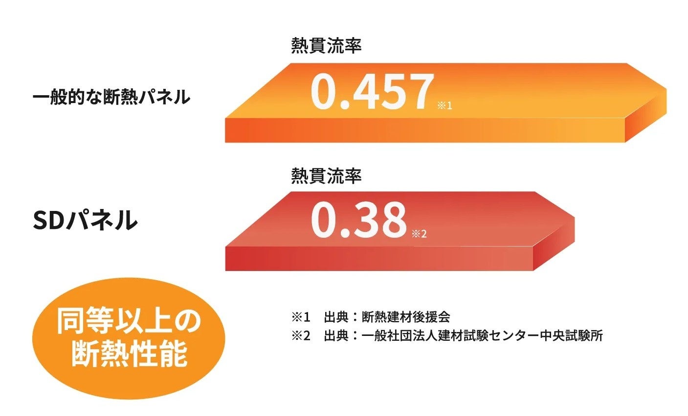 通常の断熱パネルの熱貫流率は0.457ですので(出典:断熱建材協議会)、通常の断熱パネルと同等以上の断熱性能を持っていることが証明されています。