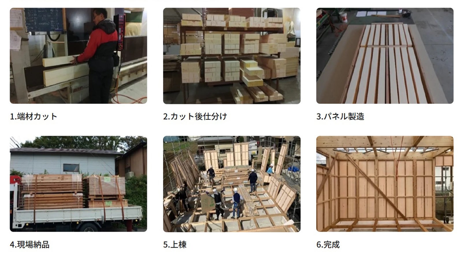 ボード系断熱材の端材と杉集積材の枠、PBで構成。パネルの内断熱は同一メーカーの端材をパネル内部に敷き詰め、特殊圧着により加工することで、通常の断熱パネルと同等の性能を実現しています。