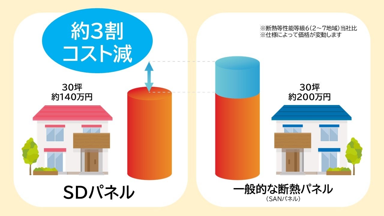 一般的な住宅の場合、通常の断熱パネルより約3割コストを下げることができます。もちろん断熱性能は変わりません。