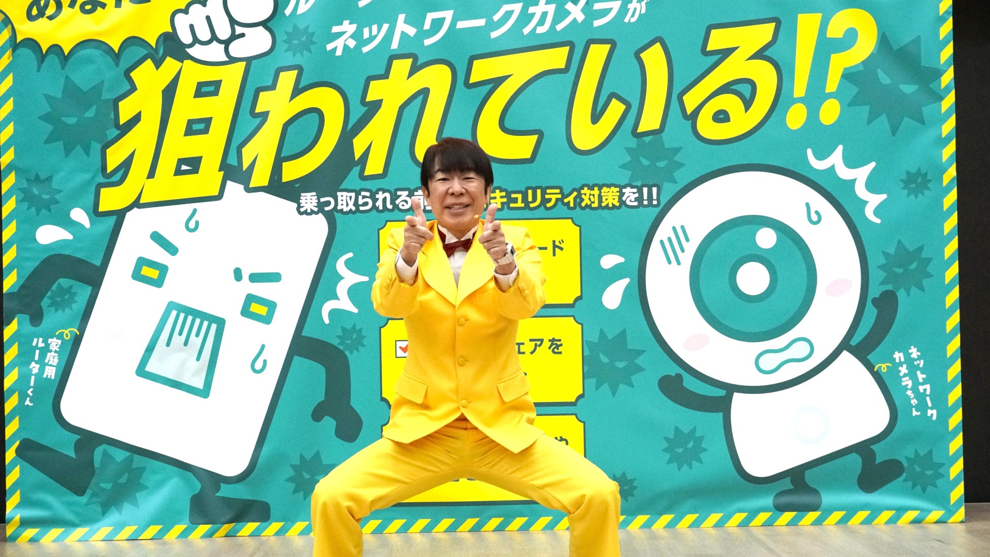 当日は、特別ゲストとして、ダンディ坂野さんが登壇。イベントの冒頭、普段からインターネットはよく利用されるかと伺われ、「大体インターネット使用しないと生きていけない状況ですね!(笑)サブスクで映画とか見ますし、Wi-Fi繋げて家でも使用しますよ!」とコメント。また、日常に潜むインターネットの危険性について、「パスワードとかね、暗証番号は簡単にしない!などはしているけど、ちゃんとした対策はやっていないかも…」と話しました。MCは「対策が大事なポイントです!」と応じ、特にルーターやネットワークカメラなどのIoT機器は、定期的に状態を確認しないと、すでに乗っ取られて悪用されている可能性があると話しました。