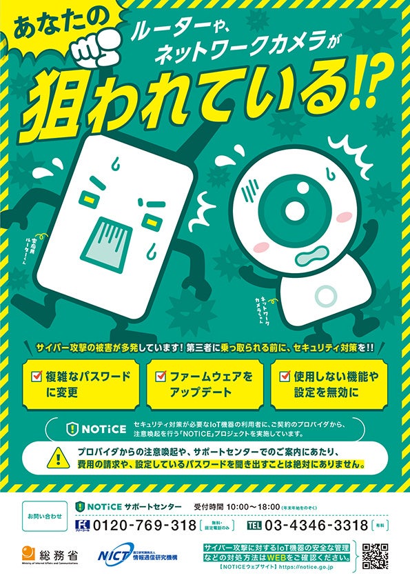 総務省では、IoT機器のセキュリティ対策向上により、サイバー攻撃の発生や、その被害を未然に防ぐための「NOTICE」プロジェクトに取り組んでいます。