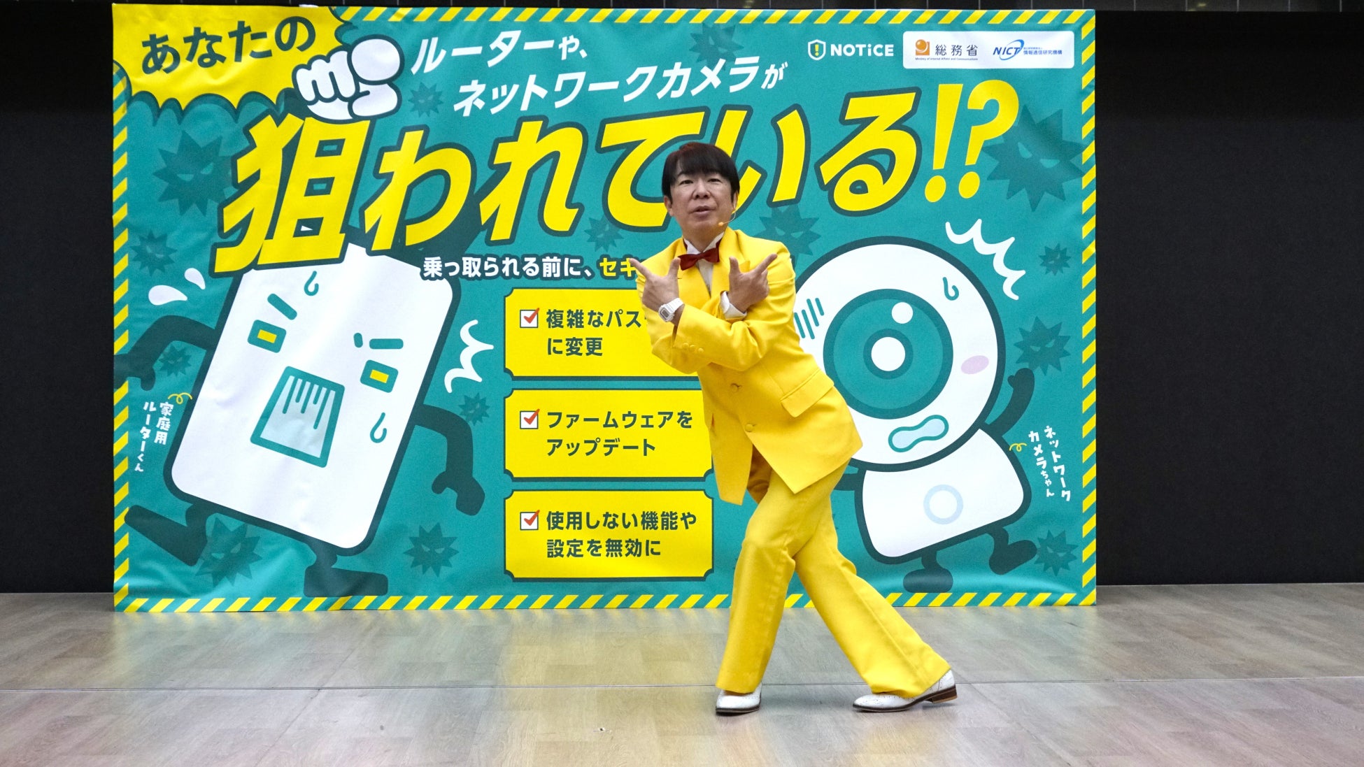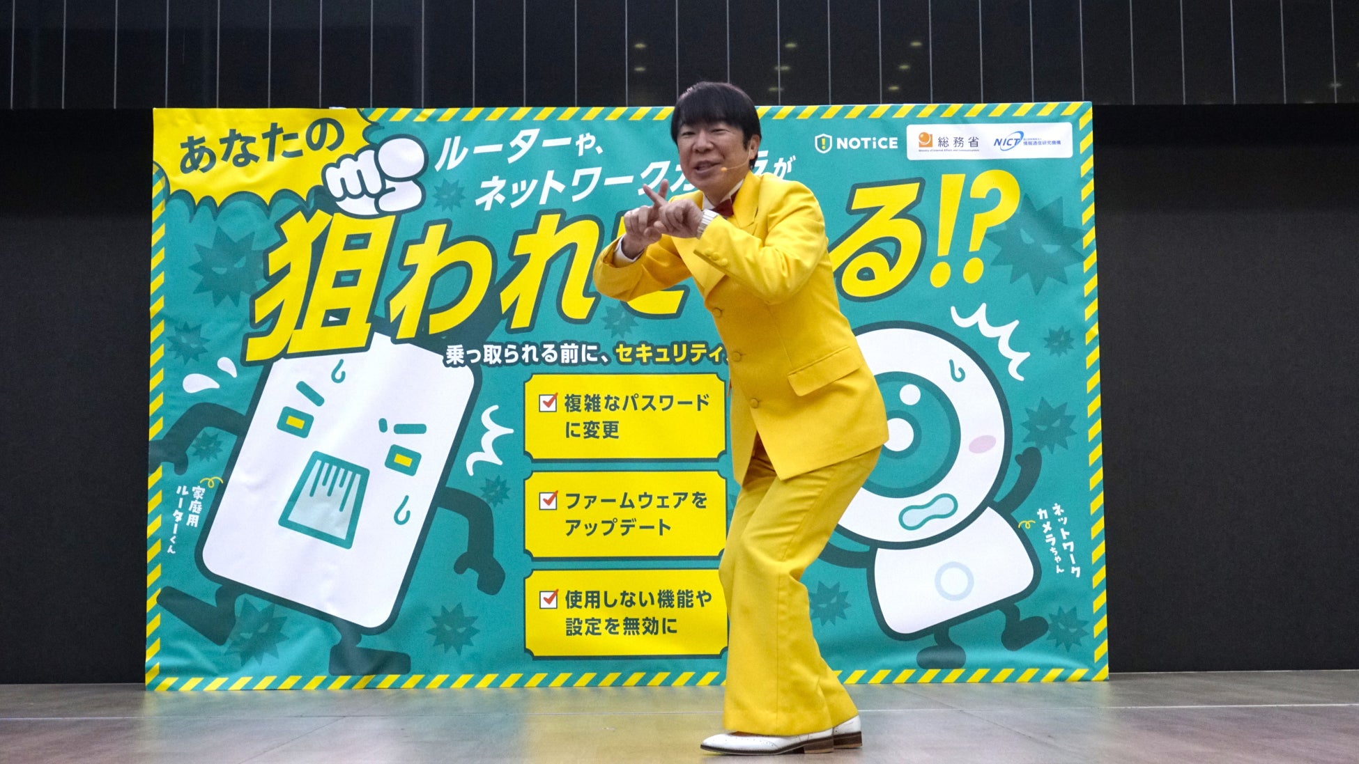 総務省では、IoT機器のセキュリティ対策向上により、サイバー攻撃の発生やその被害を未然に防ぐための「NOTICE」プロジェクトに取り組んでいます。セキュリティ対策の取り組みの一環として、2025年3月2日(日)に光が丘IMAにて、お笑い芸人・ダンディ坂野さんをお招きし、「ダンディ坂野と学ぶ!おうちのルーターのセキュリティ、ゲッツ!」を開催いたしました。