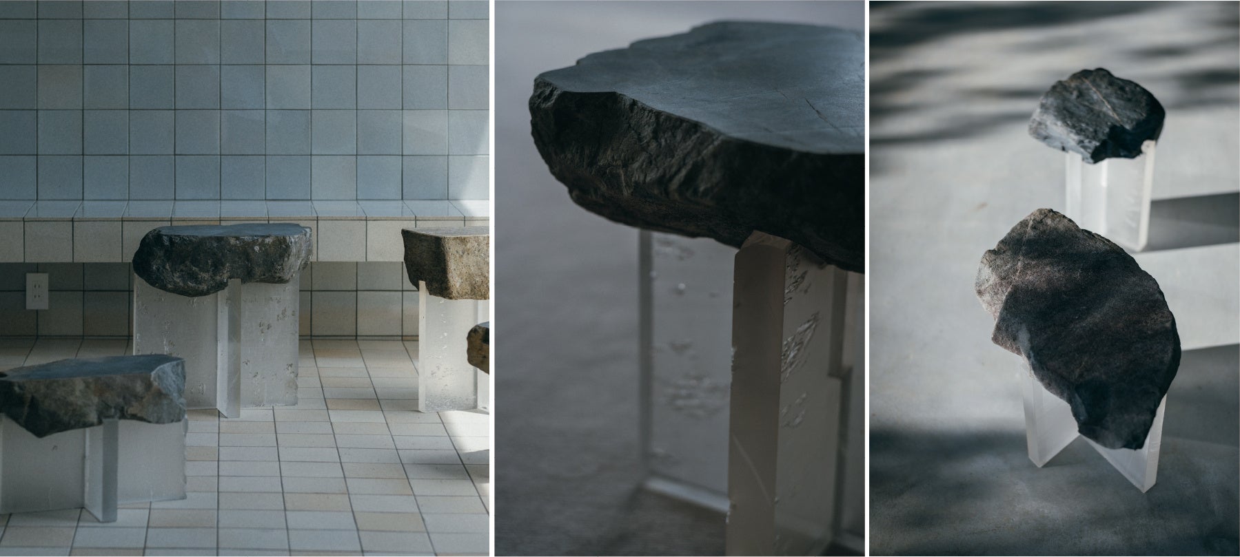 重さ、軽さに注目し、重たい石が重力に逆らい浮いているような、「不思議な感覚」をコンセプトに、Essential Storeと共同開発。脚には35mmのアクリル樹脂を使用し、外でも使える耐久性を備え、自然光が脚元を照らしたときには光が屈折し、ゆらぎのある美しい光を演出します。
