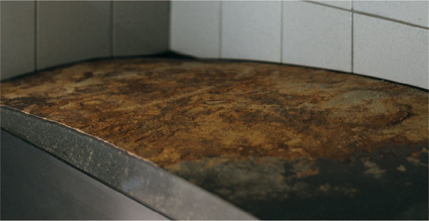 200万年前の火山活動によって形成された宮城県・大蔵山は、「伊達冠石」が採れる唯一の地。自然の力が刻まれたこの貴重な石の風合いを活かし、洗面台として大胆に取り入れました。