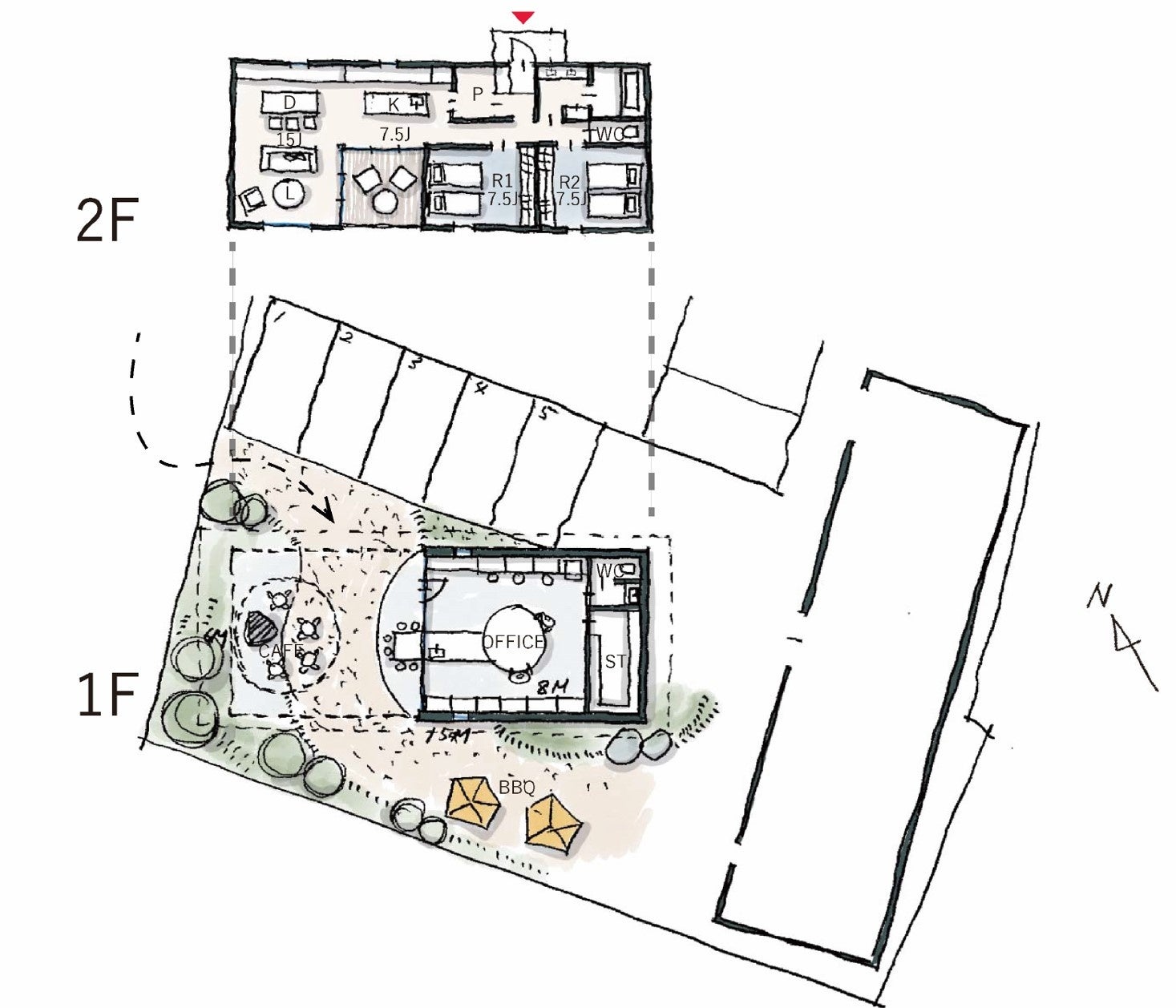 フロア構成 1Fショールーム・オフィス、2Fステイフロア