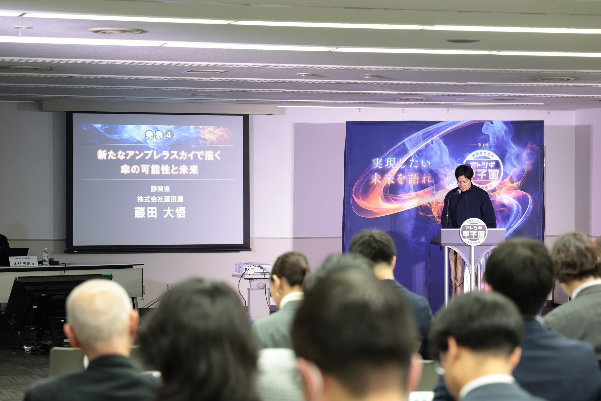 株式会社藤田屋(本社:静岡県静岡市)の事業計画部の藤田大悟が、書類審査を経て、2025年2月4日(火)に東京都で開催された経済産業省中小企業庁主催の「第5回アトツギ甲子園」地方予選大会(関東ブロック)に出場しました。傘が使い捨てとして大量廃棄されている社会問題の解決をテーマに、「“新たなアンブレラスカイ” で描く傘の可能性と未来」をプレゼンテーション。