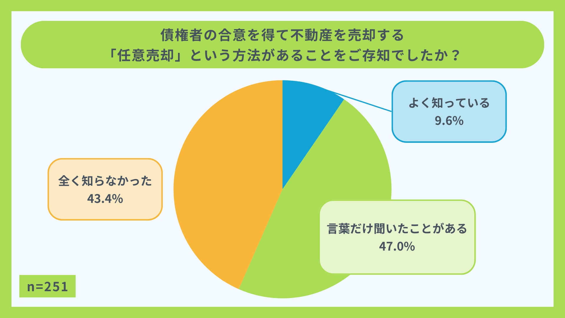 任意売却は、競売より高値で売れる可能性が高く、残債を圧縮しやすいなどのメリットがあります。しかし、“よく知っている”と回答した方は9.6%にとどまり、4割以上はまったく知らない状態です。