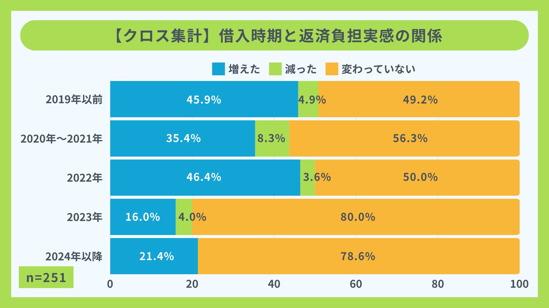 また、2019年以前に借りた層でもおよそ半数近くがすでに増加しており、一概に「長く返済しているから安心」というわけではない点が浮き彫りになりました。