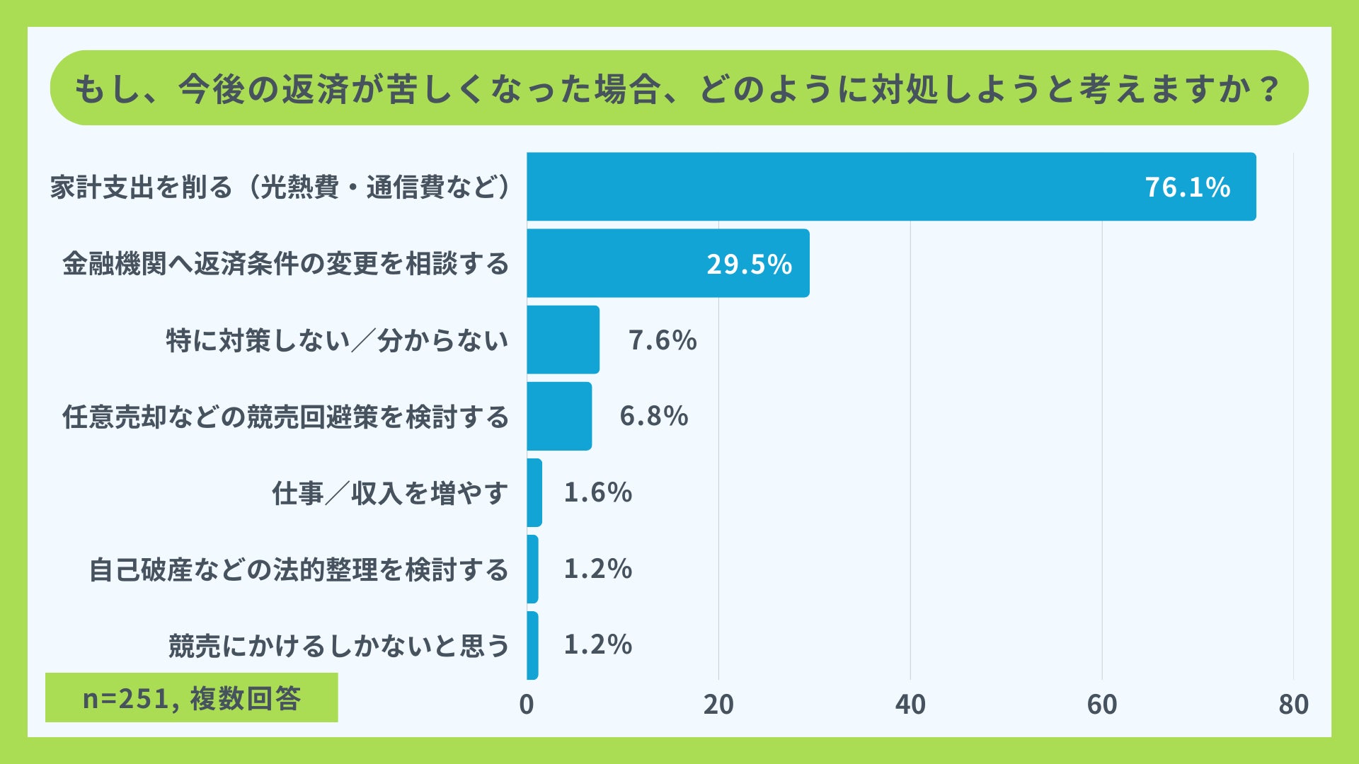 多くの方が返済苦に陥った際、まず「家計支出カット」を試みると回答。一方で「任意売却」など競売回避の具体策を挙げる方はわずか6.8%にとどまりました。