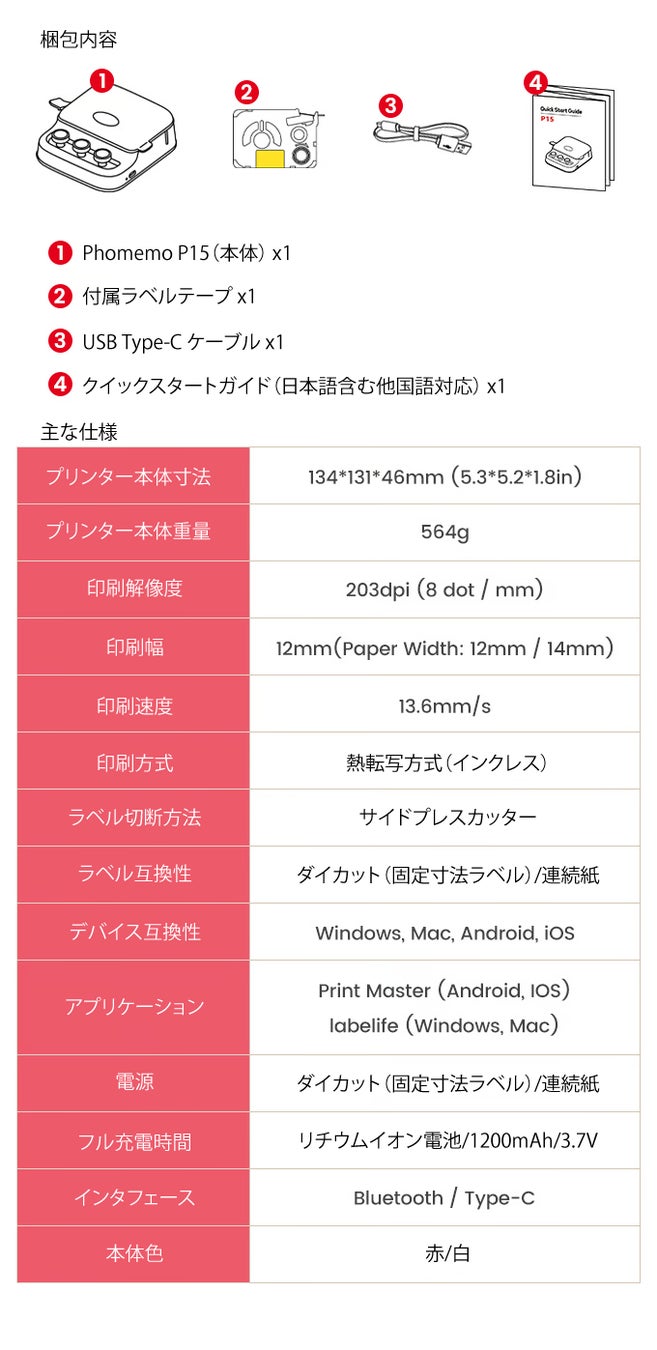 Phomemo P15本体 x1、付属ラベルテープz1、USB Type-Cケーブルx1、クイックスタートガイド(日本語対応)が入っています