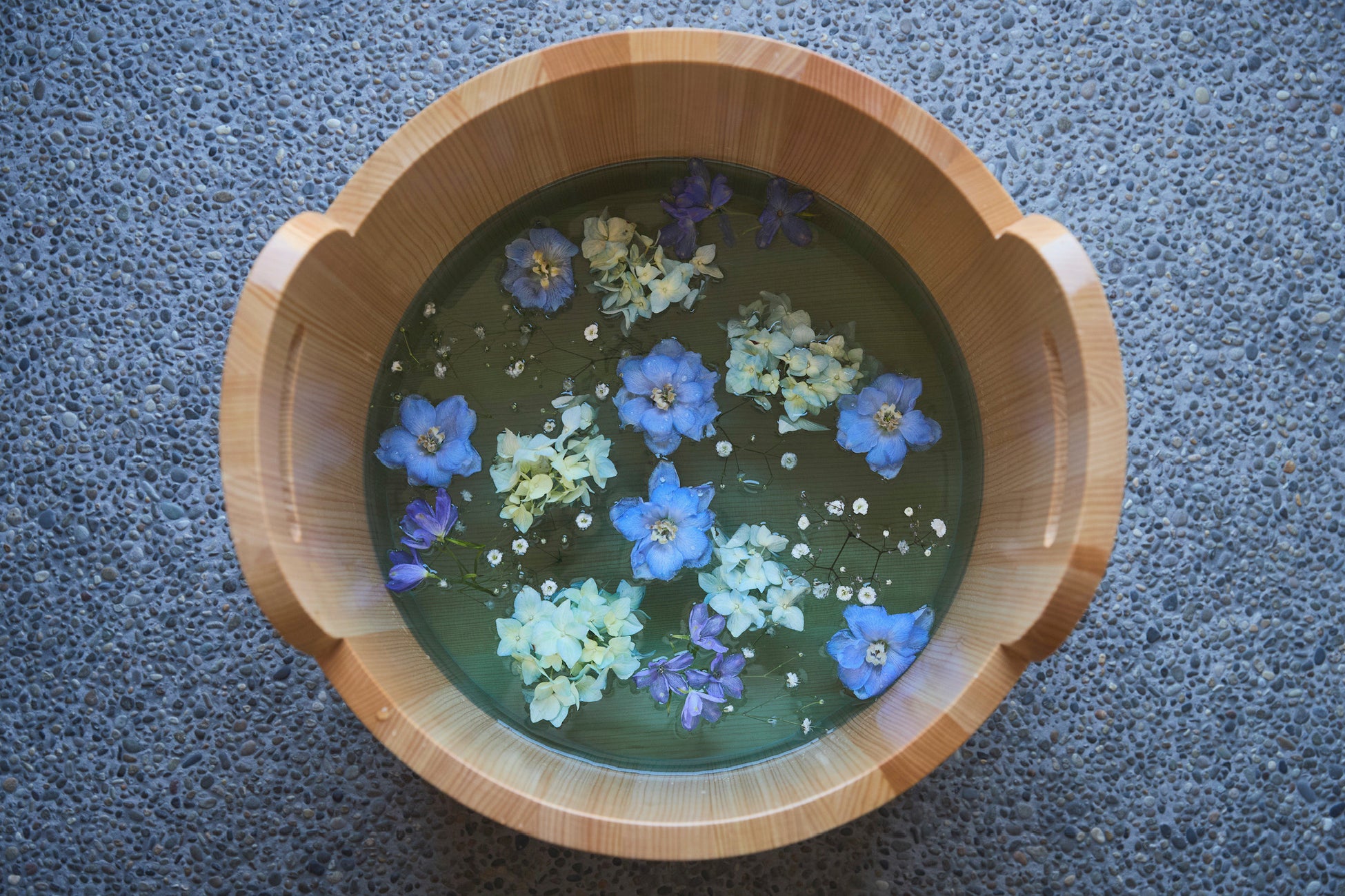 鎌倉の海や空、アジサイから連想したブルーのバタフライピー(ハーブ)のお湯に、青い花を浮かべました。足し湯をするとお湯がブルーからピンクに色が変わります。