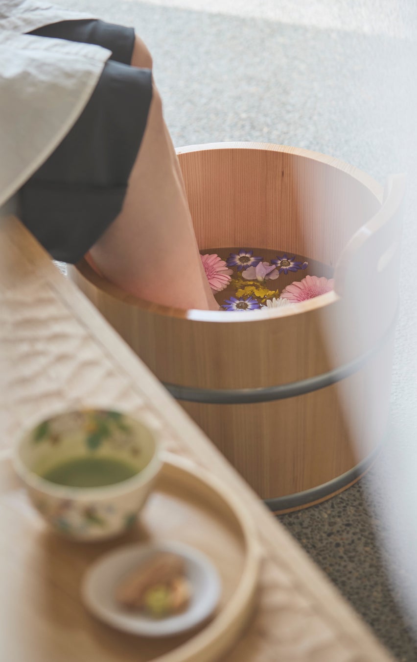 職人が手作りする檜の木桶に生花を浮かべた足湯が「SNS映えする」と20~30代女性を中心に話題となり、京都の店舗には全国から観光客が訪れています。また、インバウンド客には、マンツーマンのフットマッサージで行うおもてなし接客が、日本文化を体験しながら地元の人との触れ合いが楽しめると好評です。