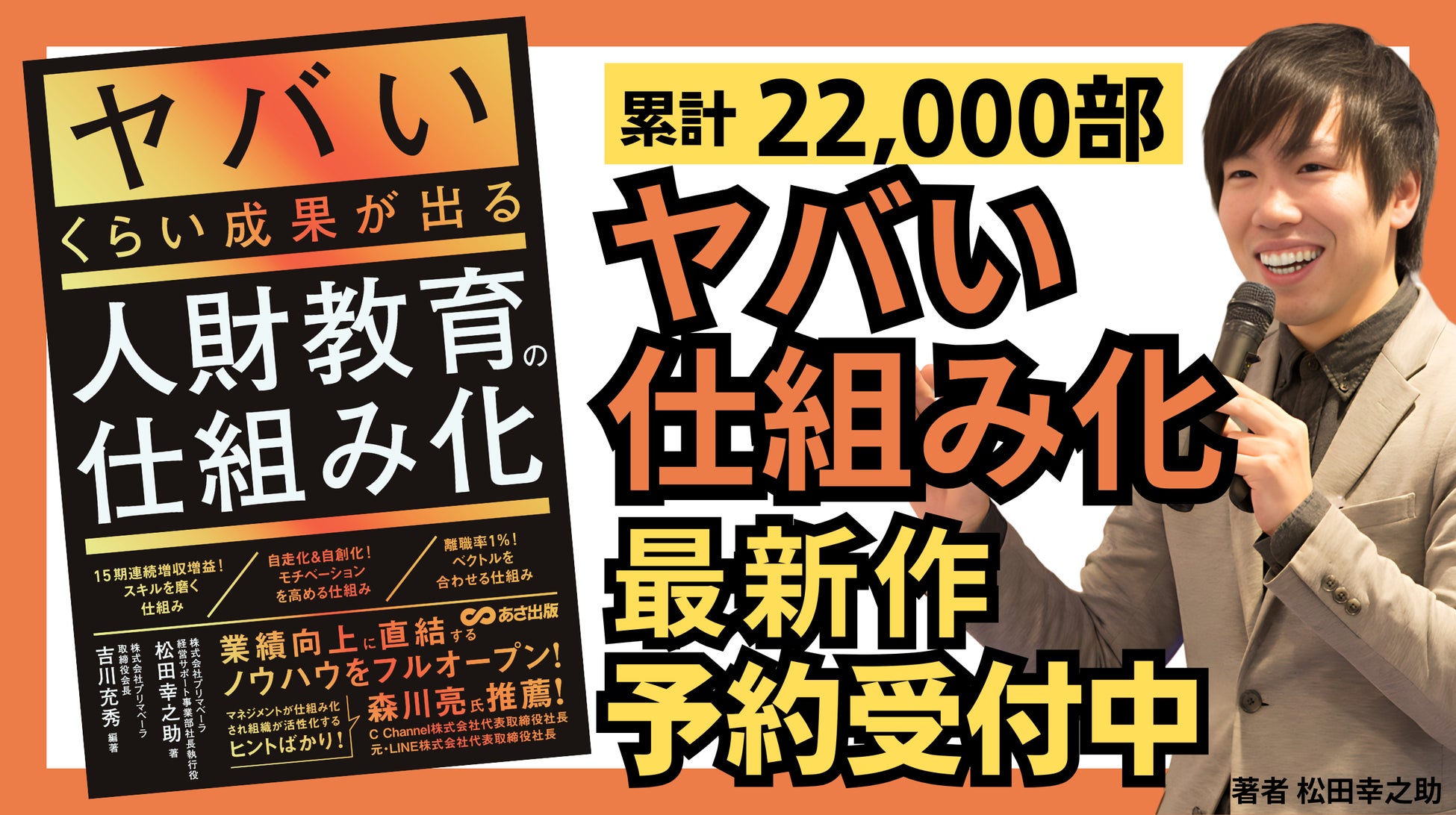 北関東を中心にリユース事業など、4事業部52店舗でグループ年商約51億円の株式会社プリマベーラ(群馬県太田市/代表 新井英雄)の松田幸之助(経営サポート事業部社長執行役兼CCO)は、株式会社あさ出版(東京都豊島区/代表 田賀井弘毅)より、松田幸之助 著「ヤバいくらい成果が出る人財教育の仕組み化」を4月22日(火)に刊行いたします。23年11月に発行された松田の初著書「ヤバい仕組み化」が、累計発行部数22,000部とヒットしたことを受け、多様化する社会での人材教育の仕組みを具体的に解説した本です。社員が成長し、成果を生む組織をつくりたい経営者や、成果を出せる人財になりたいビジネスパーソンにオススメの一冊です。