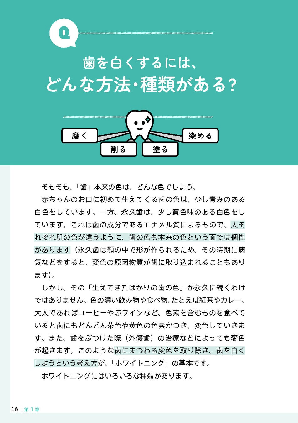 これまで患者さん向けとして詳しく語られてこなかったホワイトニングの基礎知識や最新事情について知ることができ、ホワイトニングに関心のある読者にとって貴重な一冊となっています。