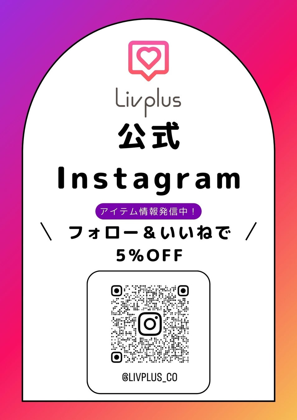 LIV PLUSのInstagramをフォロー&いいねをしてくれた方はお会計合計金額から5%off!