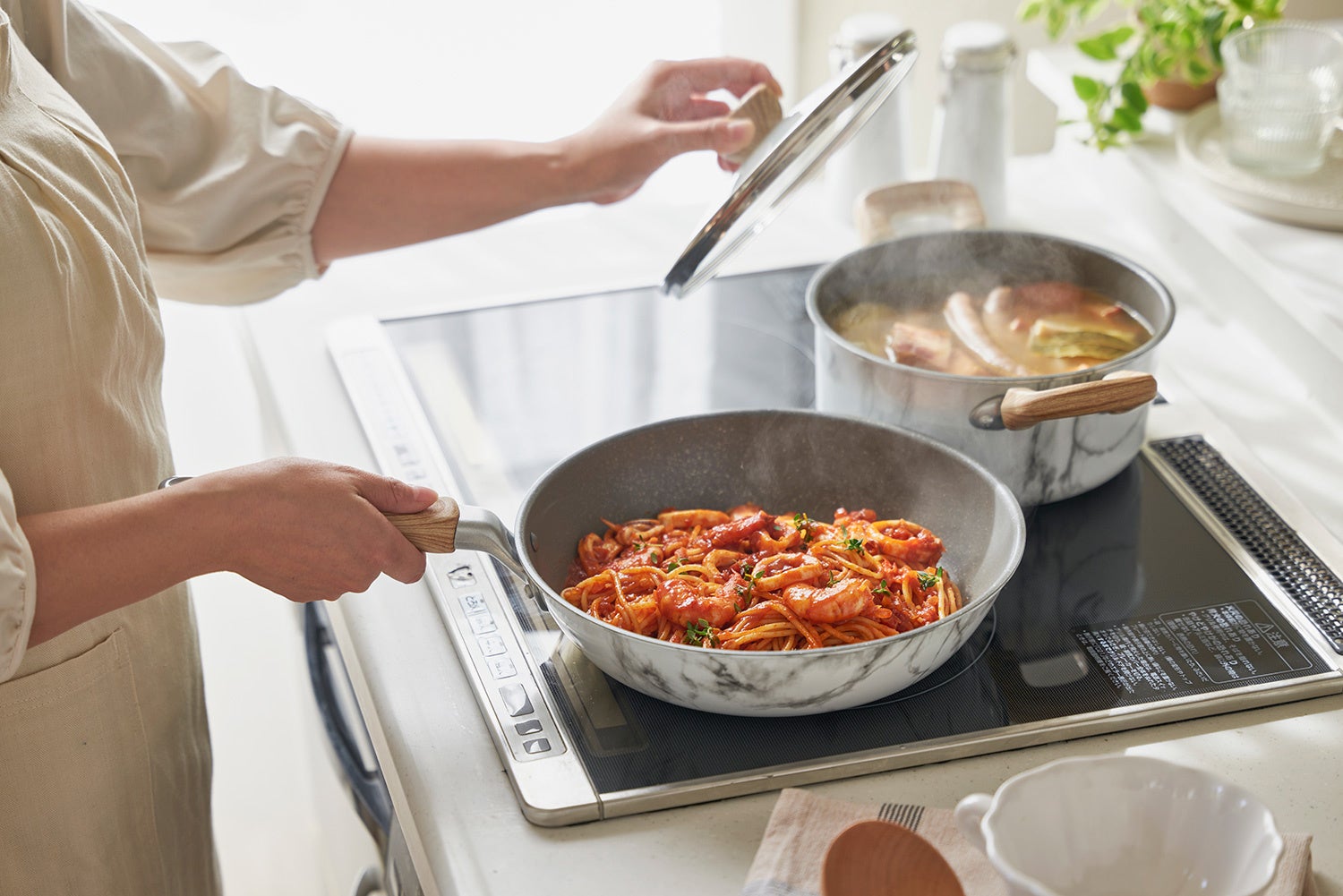天然石のような高級感あふれるデザインは、キッチンを華やかに演出します。見た目だけでなく、機能性も抜群。内面は耐摩耗性試験100万回クリアしているのでこびりつきにくく、お手入れも簡単です。高い熱伝導率で、食材にムラなく火を通し、料理を美味しく仕上げます。