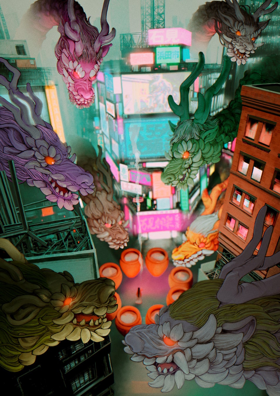 島根県の伝統芸能・石見神楽という長い歴史と深い精神性を持つ文化に、自分のイラストで関わることができたのは大きな喜びでした。EXPO2025での伝統と最先端技術が交錯する舞台であることを意識し、演目の1つである八岐大蛇退治「大蛇」を題材に、現代と伝統文化の接点を探りながら新しく違った世界観を描き出せたらという思いで制作しました。