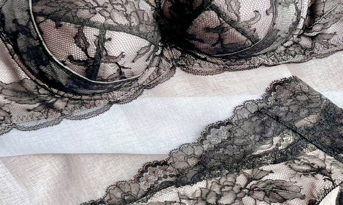 特許技術により装飾レース生地と伸縮性生地を一体化して縫製。