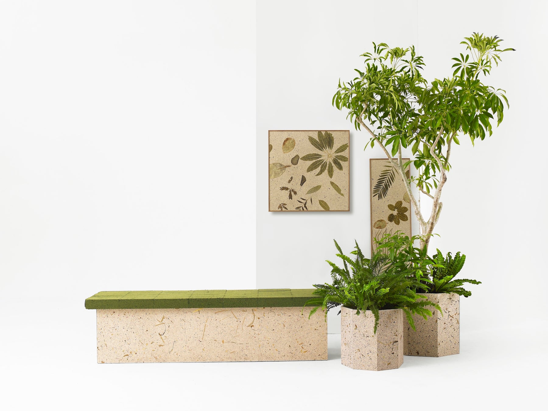 植物の剪定ゴミである「ロスグリーン」と廃棄衣料の繊維、さらに製材工場で発生するおが屑を原料とした木粉を組み合わせ、美しく再資源化した循環型リサイクル素材として活用。国内最大の観葉植物のリースサービスを展開するユニバーサル園芸社と、 設立から300年以上の歴史をもつ繊維商社のモリリン、そしてYOENが協業する取り組みです。