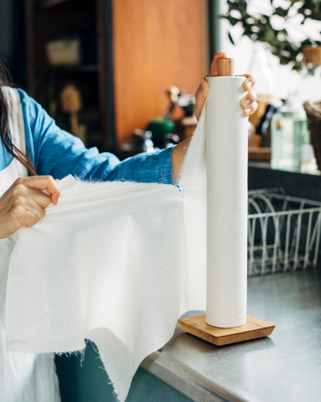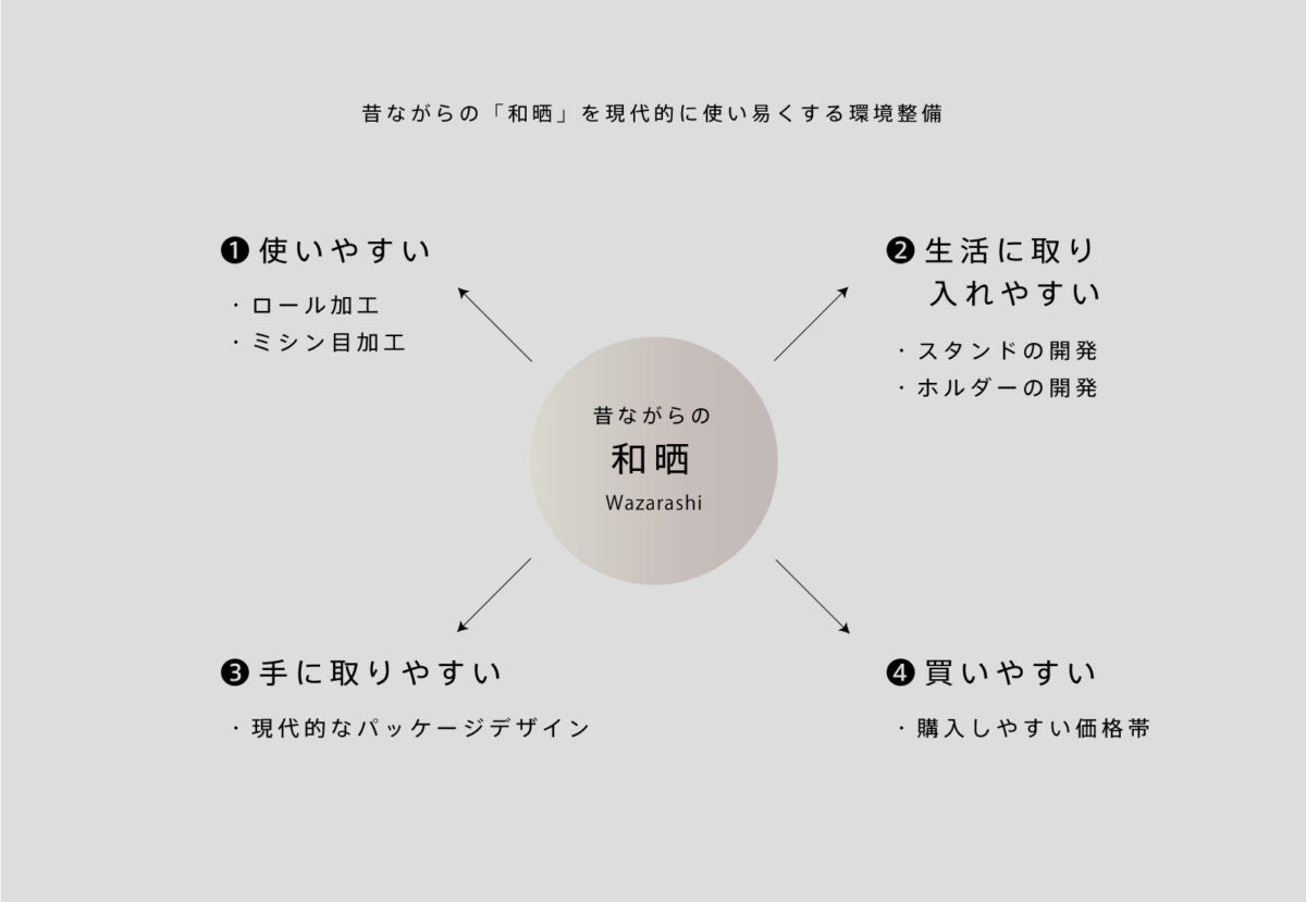 当社は、「さささ和晒ロール」の商品開発・プロデュースをしています。伝統の和泉和晒を手がけてきた武田晒工場の技術と製品を活かしたブランドとして、2021年に「さささ和晒ロール」を立ち上げました。ブランディングにおいて企画・開発したのは、「毎日の暮らしで さっと 使える」をコンセプトにしたこれまでにないロールタイプ・ミシン目入りの和晒です。