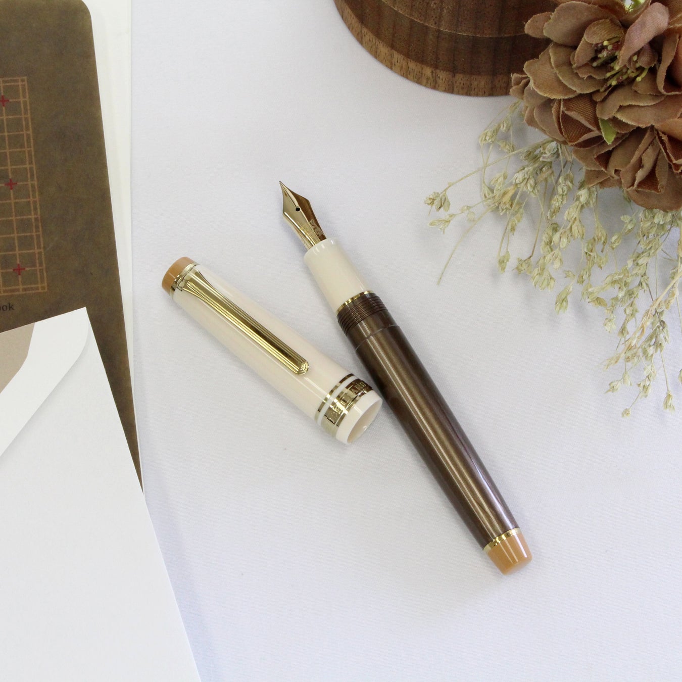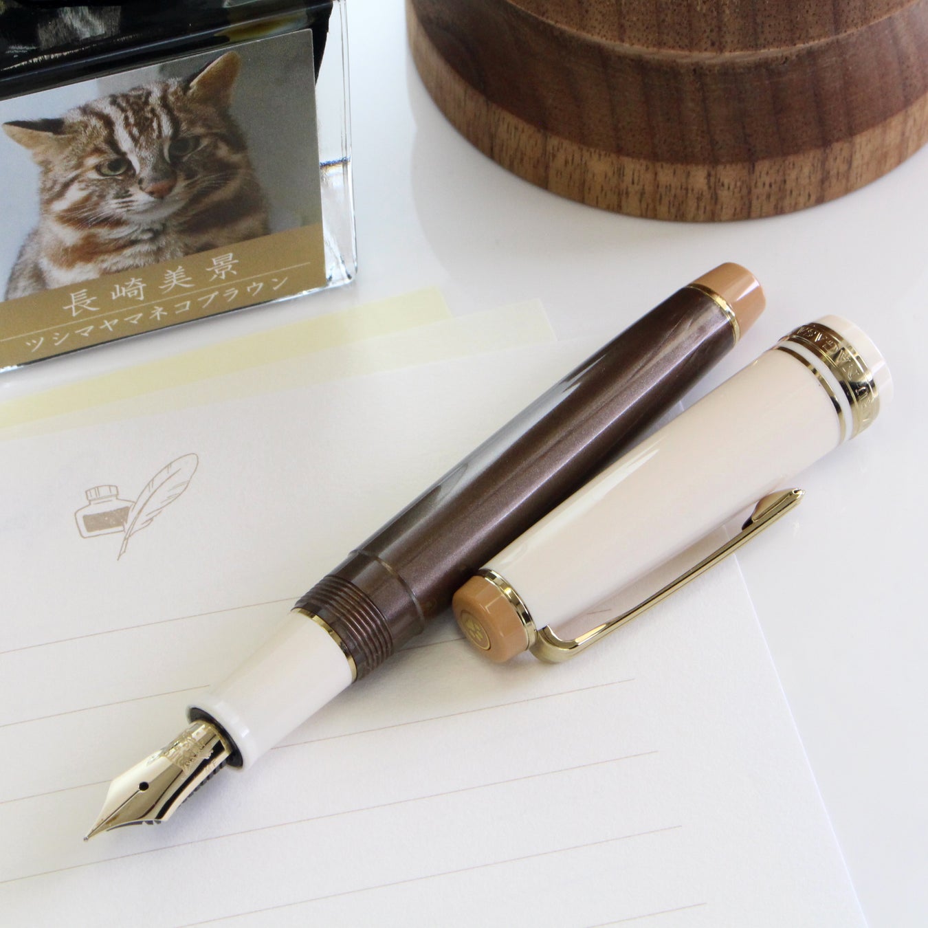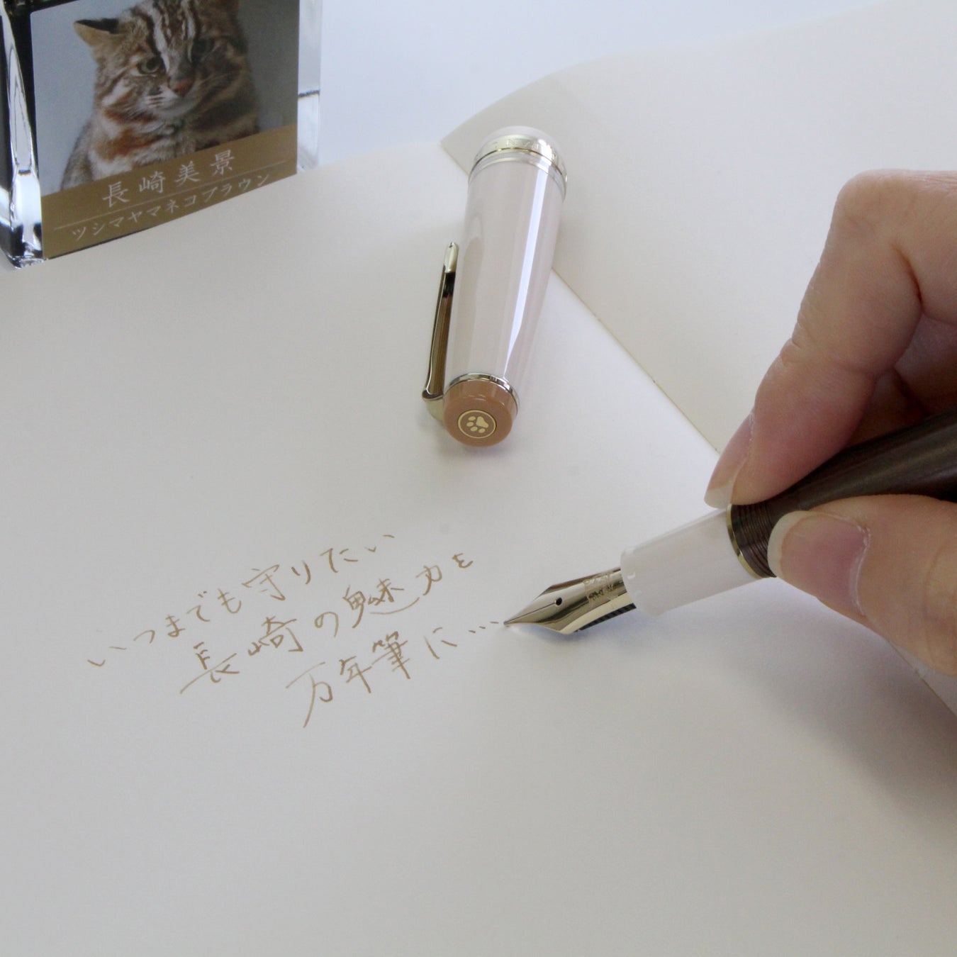 本作は、長崎県の対馬のみに生息する絶滅危惧種「ツシマヤマネコ」をモチーフとし、人気インク「ツシマヤマネコブラウン」の世界観をそのままに万年筆として仕立てた1本です。