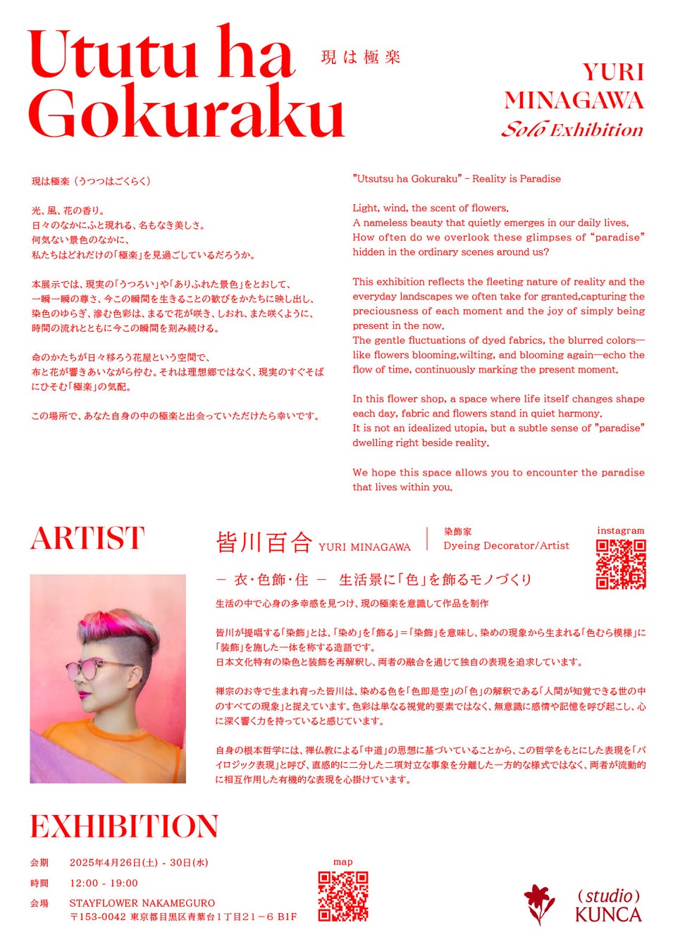 このたび、株式会社KUNCAでは、染飾家・皆川百合 / Yuri Minagawaによる染色アート展「現は極楽(Ututu ha Gokuraku)」を、2025年4月26日(土)から30日(水)までの5日間、東京・中目黒のフラワーショップ「STAYFLOWER NAKAMEGURO」にて開催いたします。