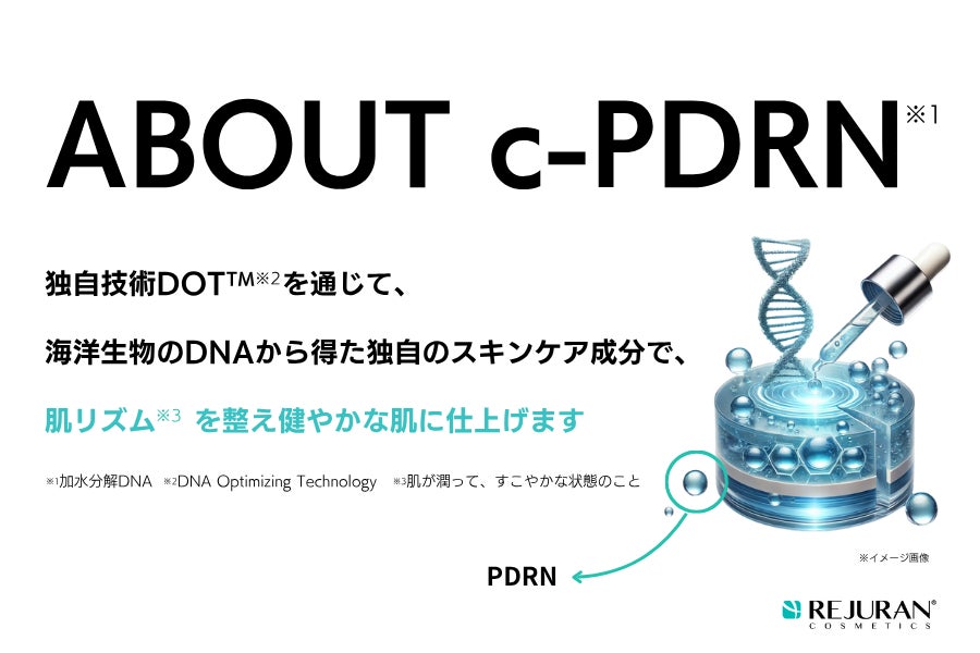 REJURAN COSMETICSの全製品には、韓国唯一の独自技術「DOTTM(DNA Optimizing Technology)※1」を用いて抽出・精製した、ブランド独自の特許成分「c-PDRN®(シー・ピーディーアールエヌ:Cosmetic Polydeoxyribonucleotide)※」を配合しています。