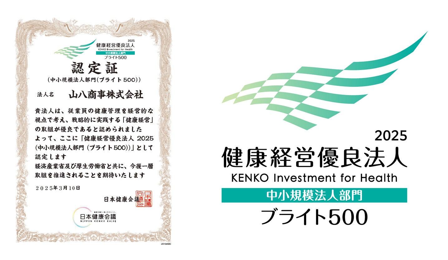 山八商事株式会社は、経済産業省と日本健康会議が共同で実施する「健康経営優良法人2025(中小規模法人部門ブライト500)」に2021年から5年連続で認定されました。