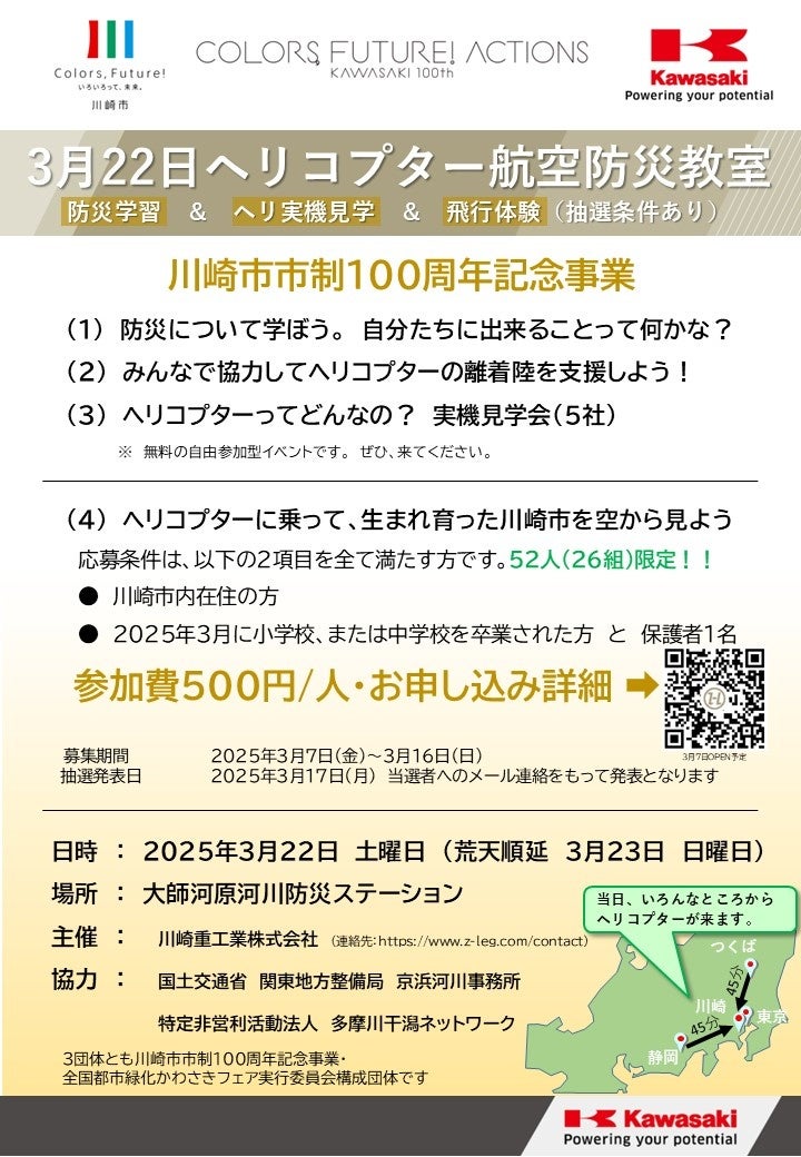 川崎重工グループが手掛けるヘリコプター手配サービス「Z-Leg™︎(ゼータ・レグ)」は、2025年3月22日 土曜日(荒天順延 2025年3月23日 日曜日)に、大師河原河川防災ステーションにおいて航空防災教室をメインテーマとしてイベントを開催いたします。