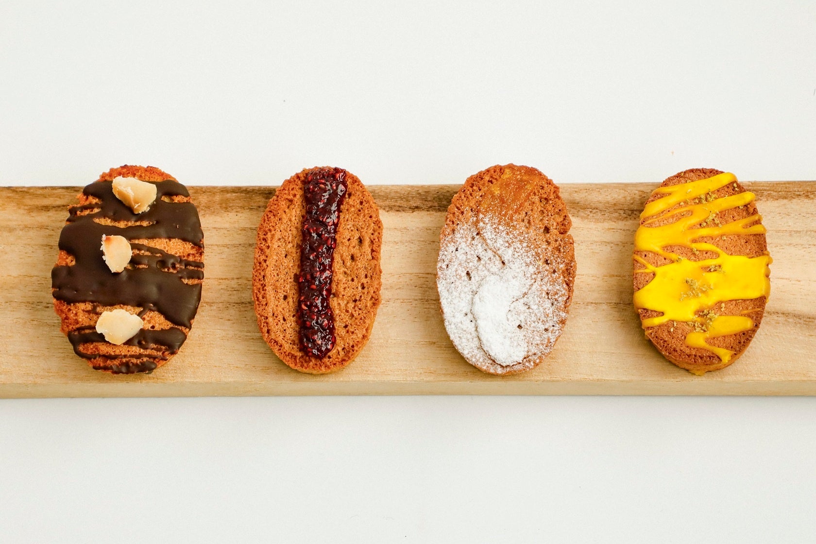 外はカリッと香ばしく、中はふんわりとした食感が特徴の「フィナンシェ」。焼成前にひと手間加えることで独特な形状、食感になり、外はカリカリ・中はふんわりとした食感に仕上がっています。フレーバーはプレーン・アールグレイ・チョコ・オレンジジャム・フランボワーズジャム・季節限定有機レモン。オリジナル商品「フィナサンド」は、フランス産小麦粉を配合したカリカリ食感の特徴的なフィナンシェ生地に、フランス産発酵バターとチョコレート大納言をサンド。