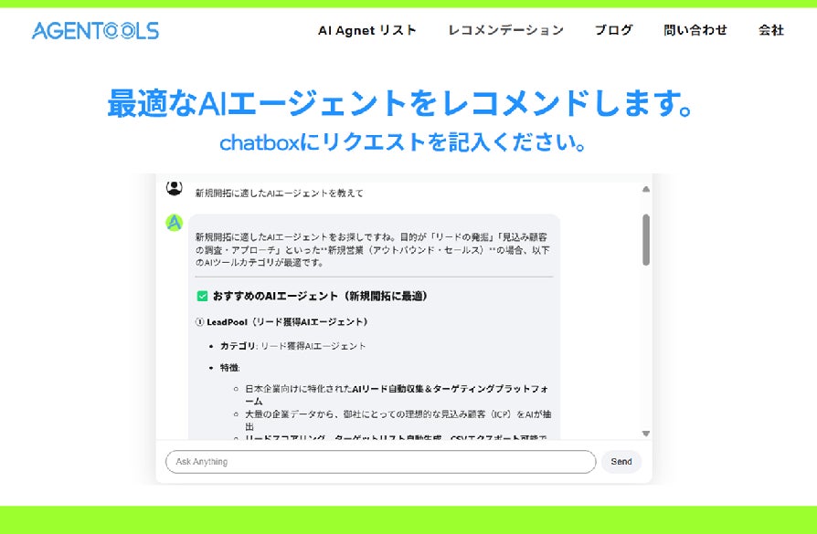 「Agentools」は、最適なAIエージェントを見つけ、導入・活用を成功させるためのソリューションです。WEBサイトから簡単なコメントを入力するだけで、課題解決に最適なAIエージェントを提案します。 強みは「徹底したリサーチに基づくレコメンデーション」と「個別支援」です。 市場のAIエージェントを深くリサーチし、機能、性能、価格、信頼性などを分析・評価。その結果を精緻なデータベースに蓄積しています。単なる紹介ではなく、エージェントの 客観的な評価を行い、ユーザーが導入に失敗しないことを第一義に支援をします。