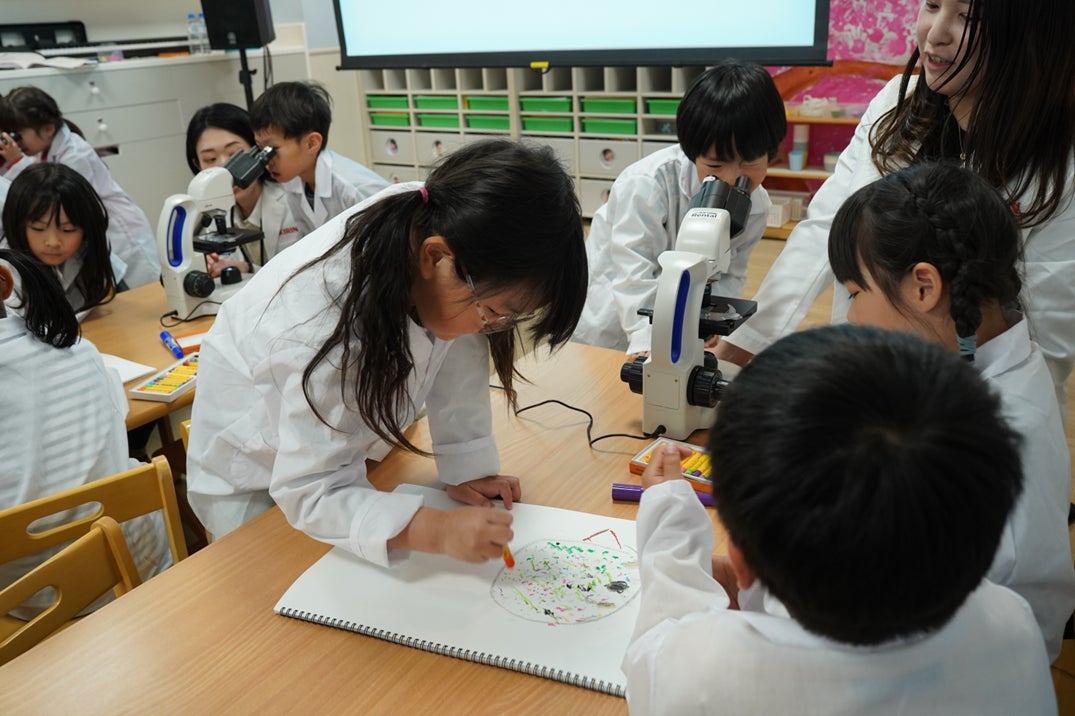 続いて、顕微鏡を使って本物の「プラズマ乳酸菌」の様子を観察。観察中には園児から「動いてる!」「丸や色んな形に変わって見える!」などプラズマ乳酸菌の動きについて驚きの声があがりました。また、粒状である乳酸菌の特徴的な形を真剣にスケッチする園児の姿も見られました。