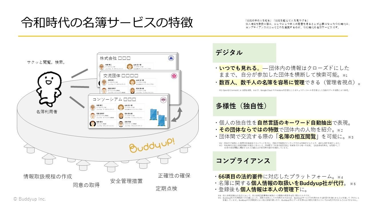 令和時代の名簿は「所有から利用」へ。名簿の作成者に義務付けられる法定項目をBuddyup!が代行することで、コンプライアンスを守りつつ、カンタンに名簿を利用できるようにします。