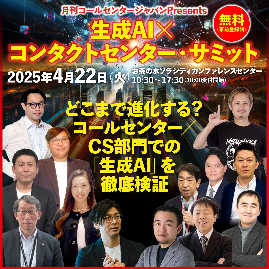 株式会社リックテレコムが発行する「月刊コールセンタージャパン」編集部は、2025年4月22日(火)、オフラインイベント「生成AI ✕ コンタクトセンターサミット」を東京都・御茶ノ水の御茶ノ水ソラシティカンファレンスセンターで開催します。