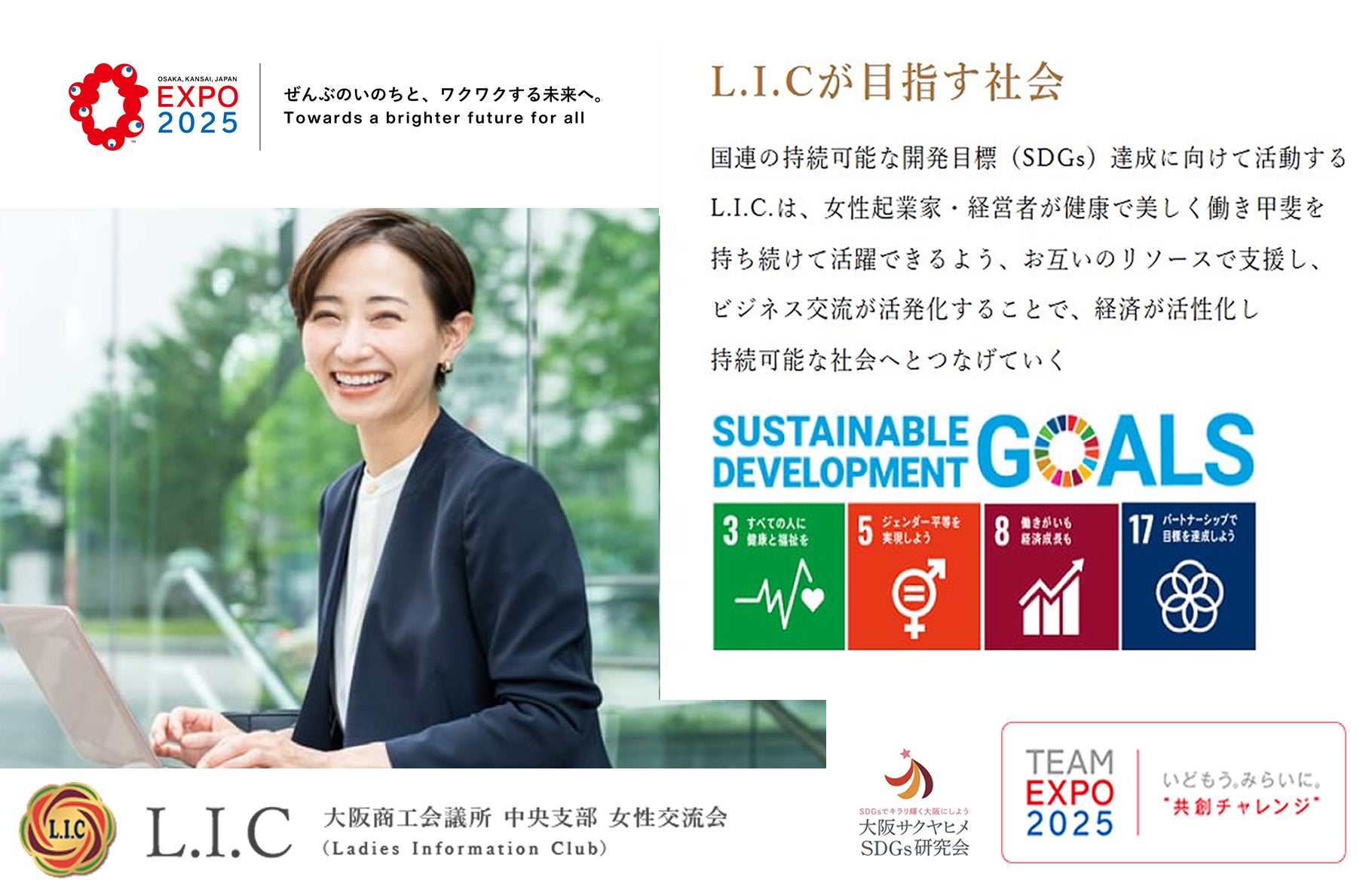 本イベントは、関西を中心に事業を展開する女性経営者や指導的立場の女性たちが集まり、リーダーシップやビジネスの発展に向けた取り組みを推進する場となります。女性交流会 L.I.Cは、万博の「TEAM EXPO 2025 共創チャレンジ」のメンバーとしても積極的に活動し、分科会を通じて、多様な視点から未来を創る活動を展開しています。