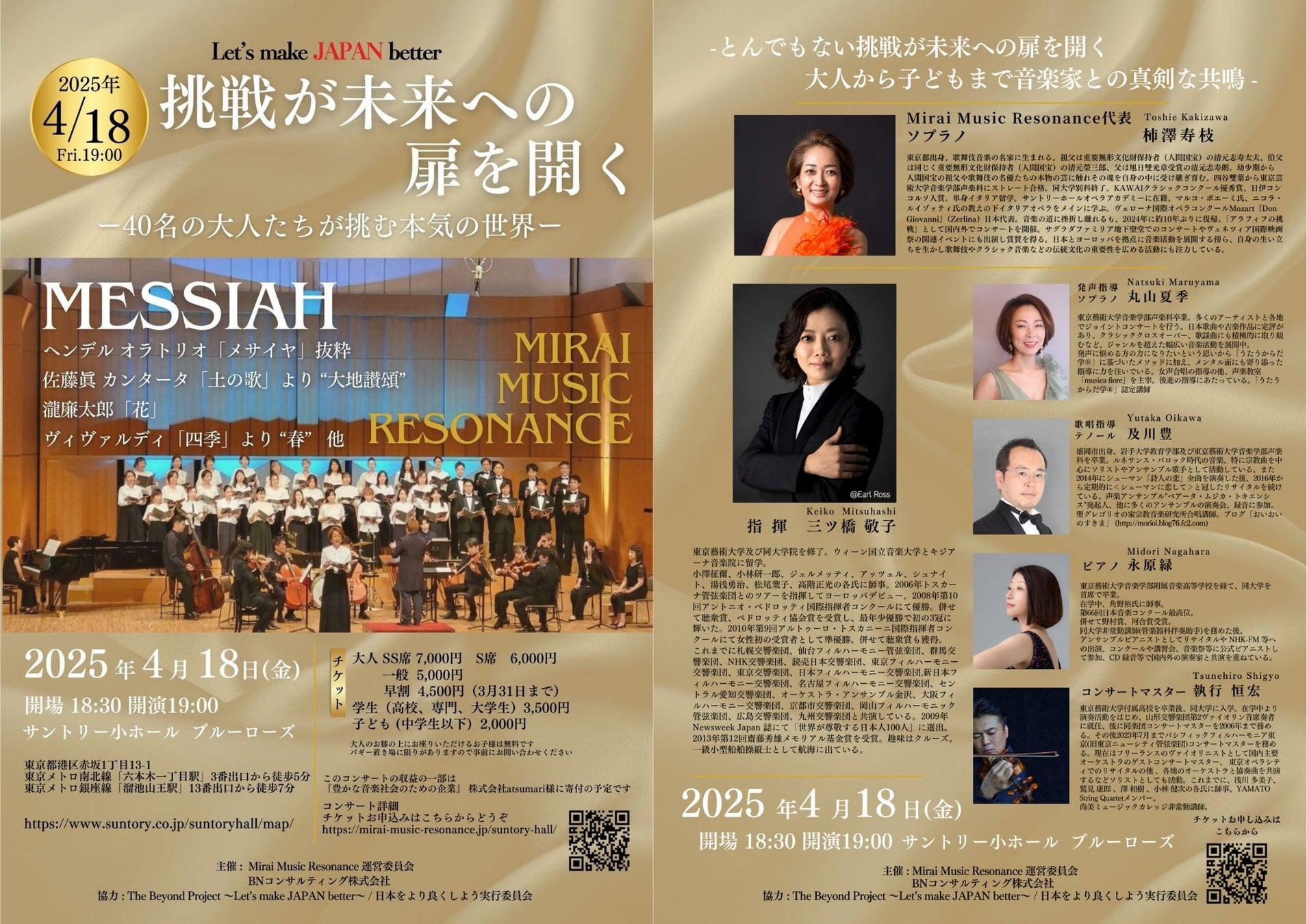 本コンサートで指揮を務めるのは、Newsweek Japanの『世界が尊敬する日本人100人』に選ばれた世界的指揮者、三ツ橋敬子氏です。彼女の指揮のもと、40名の素人合唱団と一流音楽家たちが集結し、「Messiah(メサイア)抜粋」や「大地讃頌」など4曲を歌い、音楽を奏でます。本コンサートは、40名の大人たちの挑戦と「旦那衆」という日本の文化芸術を支えるマインドの両面を体験できる場となります。