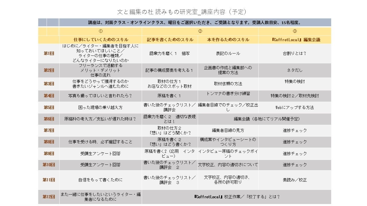京都でのリアル開催とオンラインの同時開催の講座です。日本各地のライター・編集者にぜひご参加いただきたいと考えています。