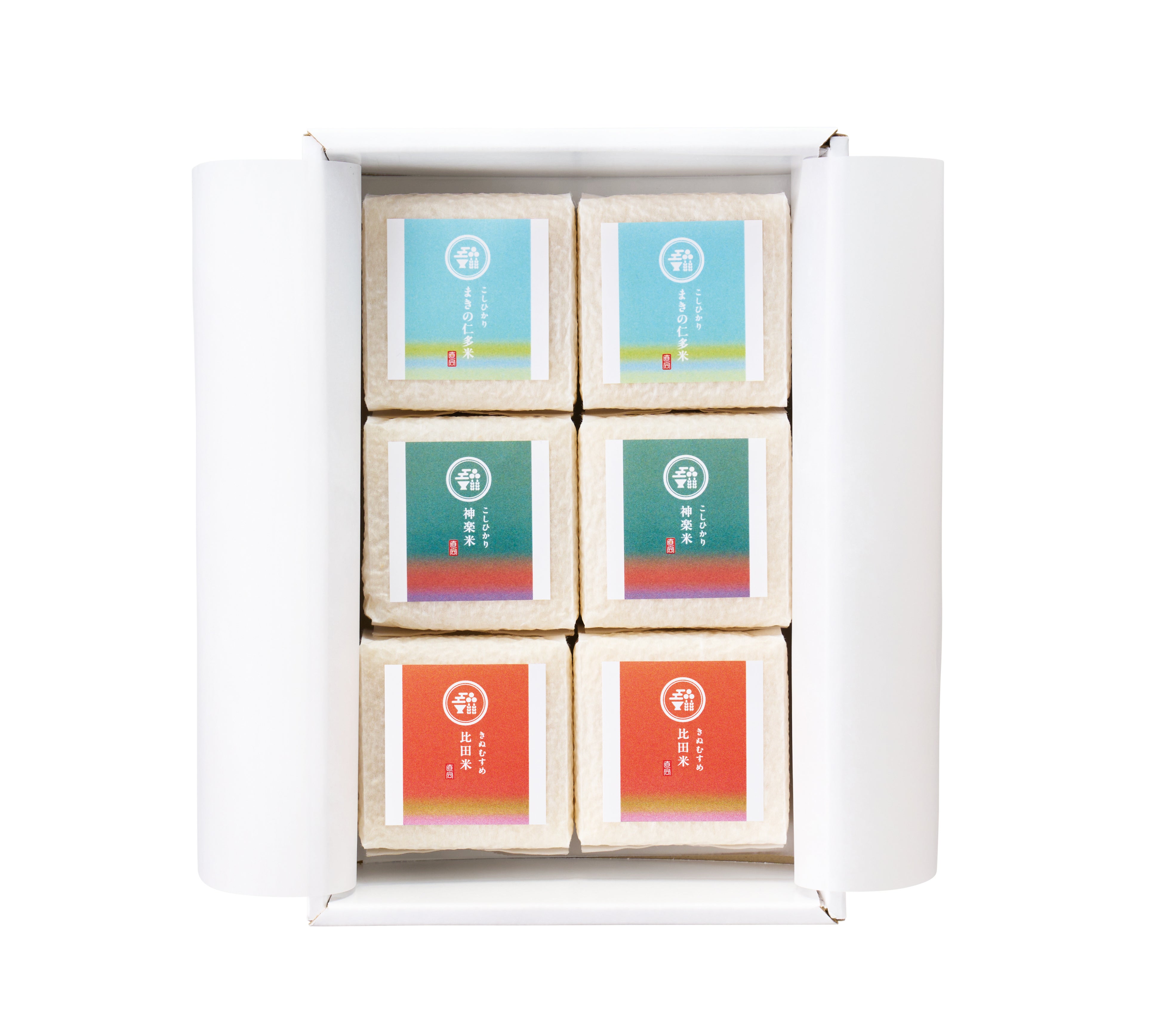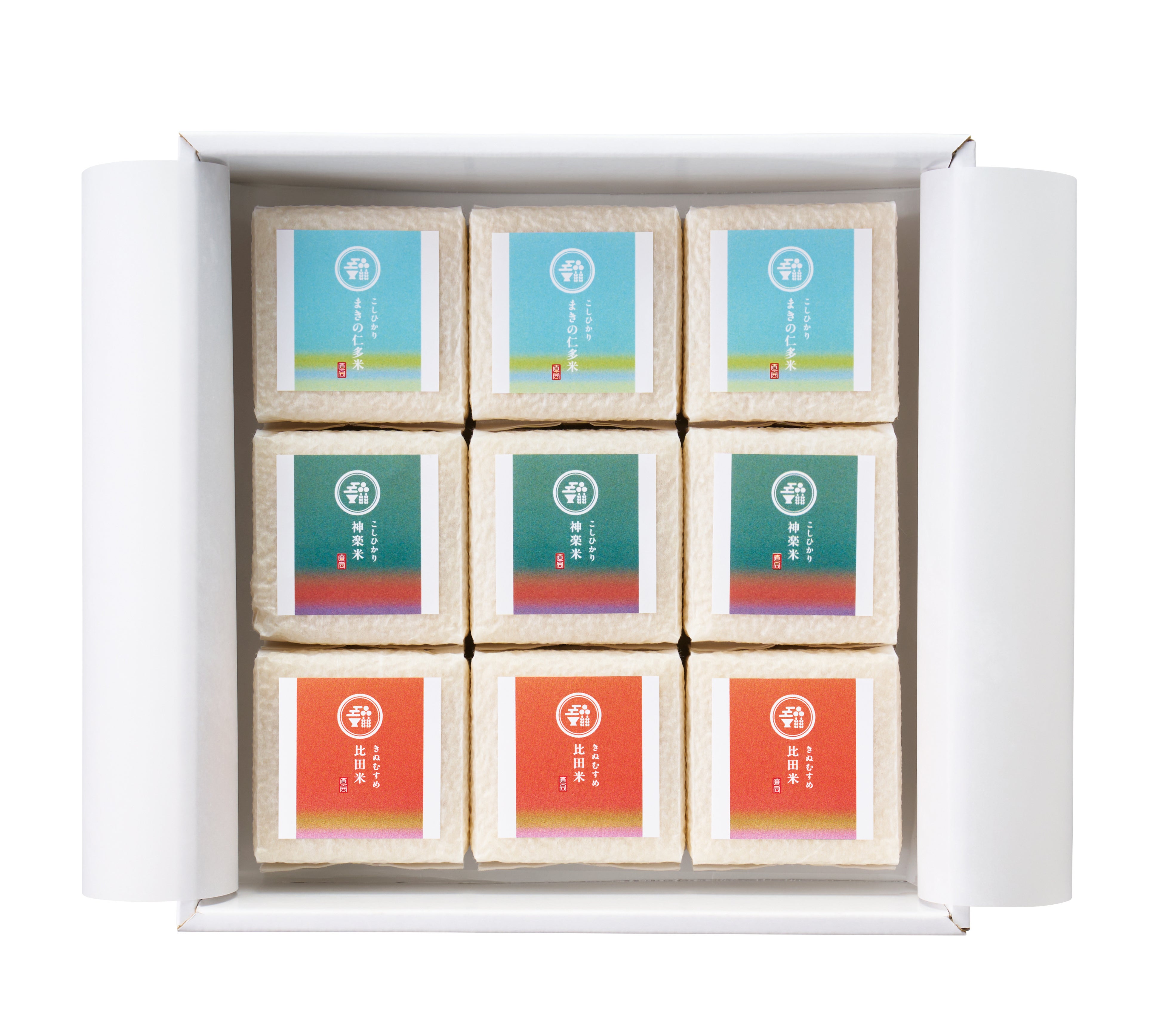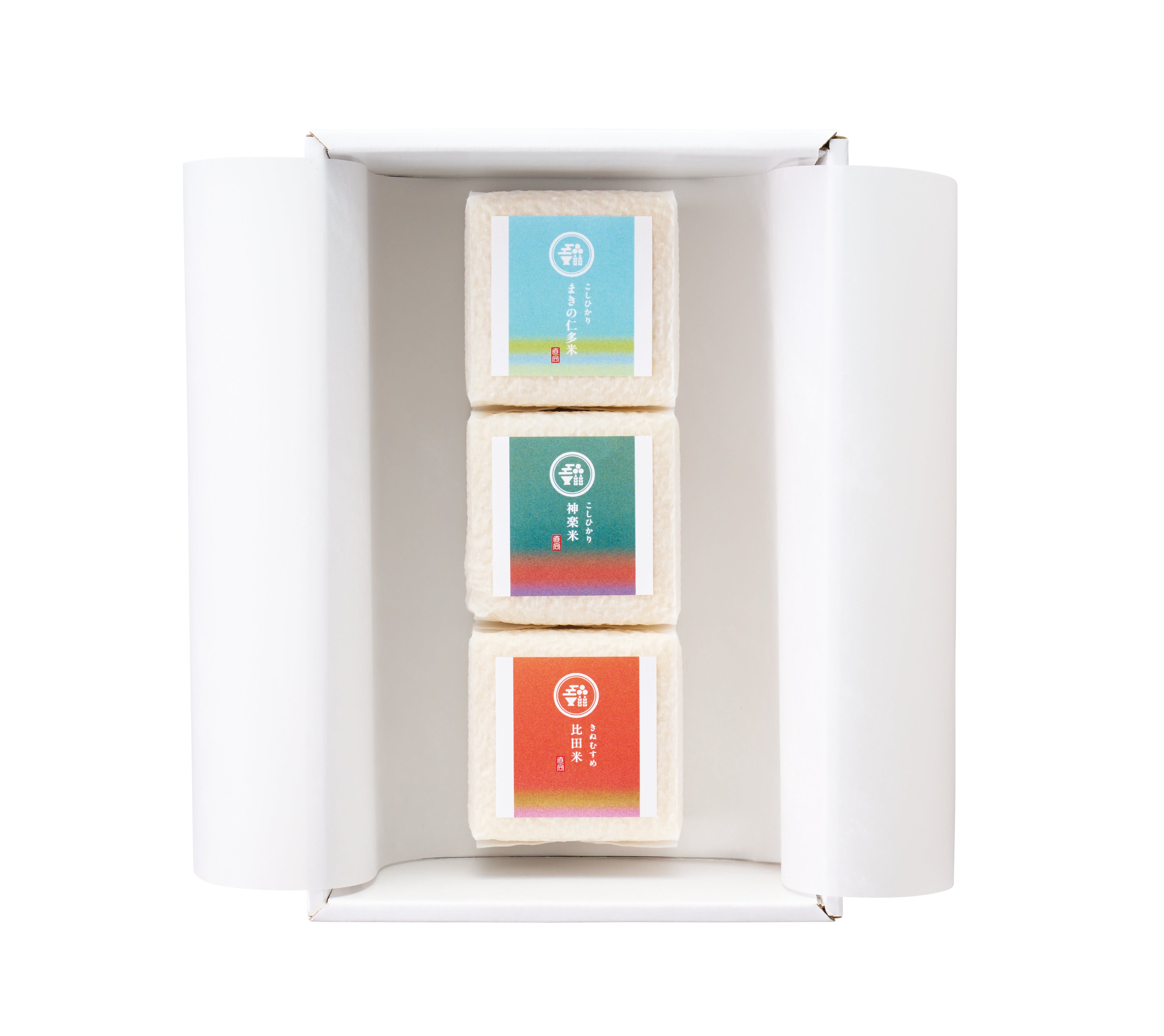 “東の魚沼、西の仁多”と称される西日本屈指のブランド米「仁多米」。その中でも特に上質とされる馬木(まき)地区の「こしひかり・まきの仁多米」をはじめ、「こしひかり・神楽米」、「きぬむすめ・比田米」の3種を、2合ずつ真空パックしたキューブ米に仕立てました。品種・産地ごとの個性を味わえる贈り物。