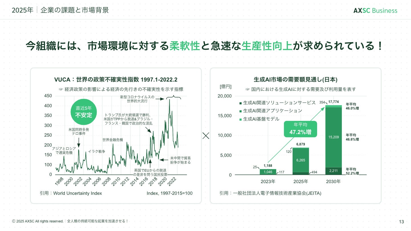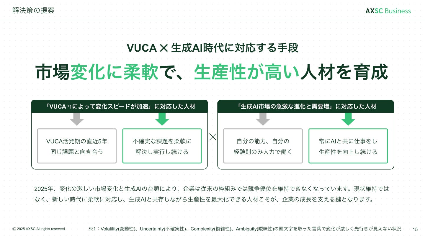 2025年、VUCA(不確実性・複雑性・変動性の時代) が加速し、変化の激しい市場変化と生成AIの台頭により、企業は従来の枠組みでは競争優位を維持できなくなっています。現状維持ではなく、新しい時代に柔軟に対応し、生成AIと共存しながら生産性を最大化できる人材こそが、これからの企業の成長を支える鍵となります。