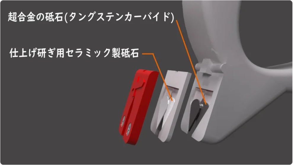 両砥石ともピンチング方式で砥石側が刃先の角度に自然に合わせることができるので、これまでの刃物研ぎのように砥石に合わせて刃先の角度調整をしなくても済む利点が売り。
