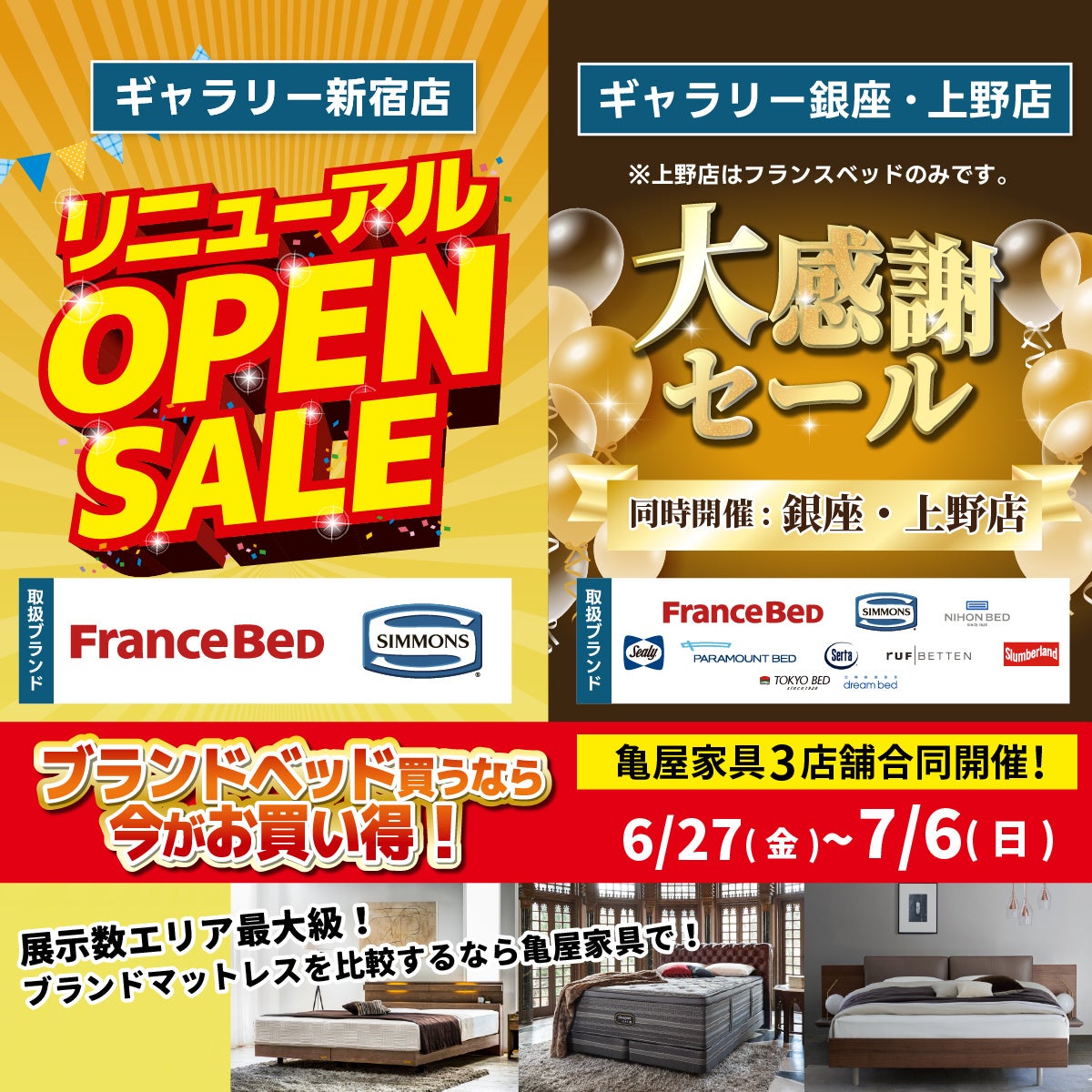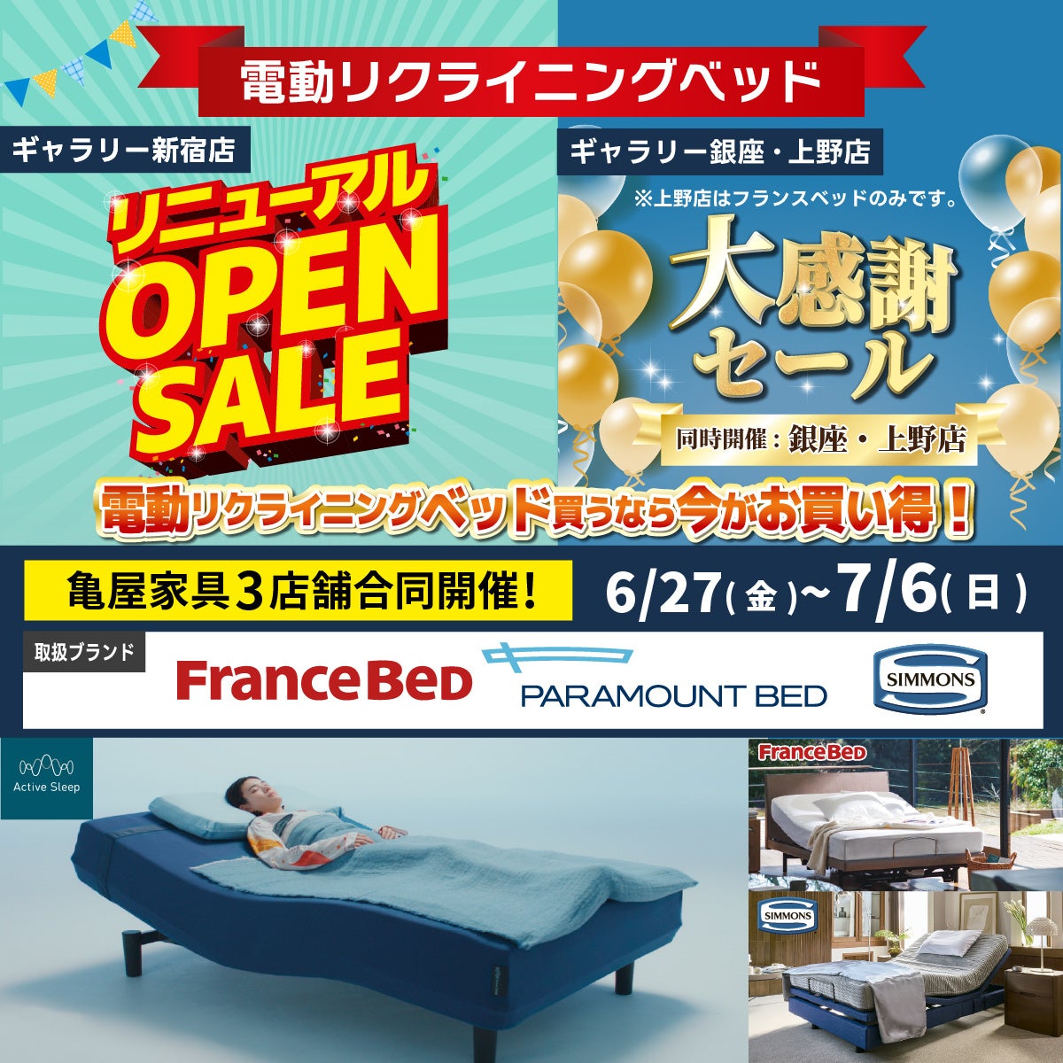 亀屋家具(https://www.kameyakagu.jp/)は、6月27日(金)に〈ギャラリー新宿〉を全面リニューアル。新たに高級ベッドブランド「シモンズ」をラインナップし、エリア最大級※¹の展示規模で“寝心地の体験価値”を強化します。これを記念し、銀座・上野の各ギャラリーと連動した『リニューアルオープンセール』を開催。期間中はイベント限定価格に加え、購入・来場で得られる豪華特典を多数ご用意しました。
