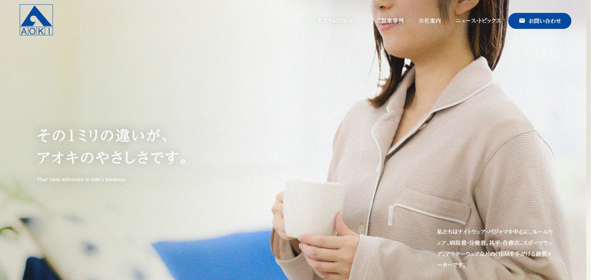 株式会社アオキ様の強みである、高品質なモノづくり。その確かな技術と、肌に触れるナイトウェアやパジャマの着心地、温かな印象を最大限に表現するWebサイトを目指しました。