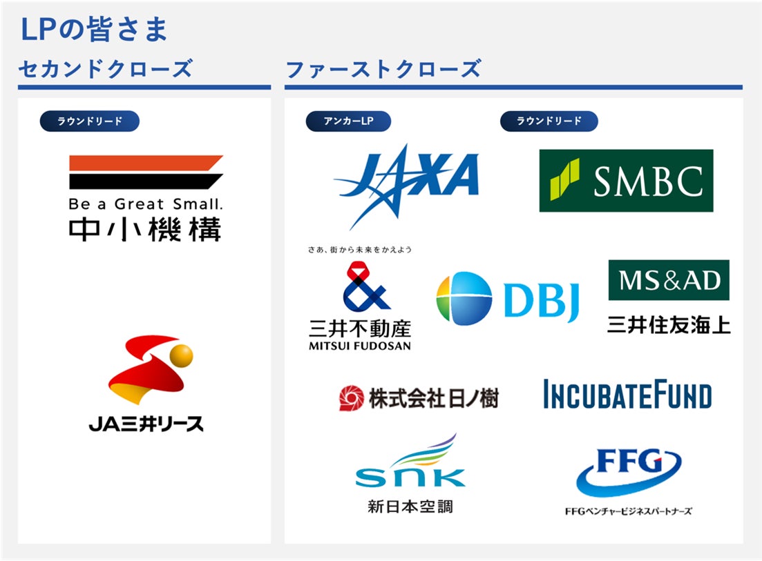 本セカンドクローズまでに、JAXA 、三井住友銀行、三井不動産、日本政策投資銀行、三井住友海上火災保険、日ノ樹、インキュベイトファンド、新日本空調、FFGベンチャービジネスパートナーズなどの日本を代表する機関投資家・事業会社等に参画いただいております。