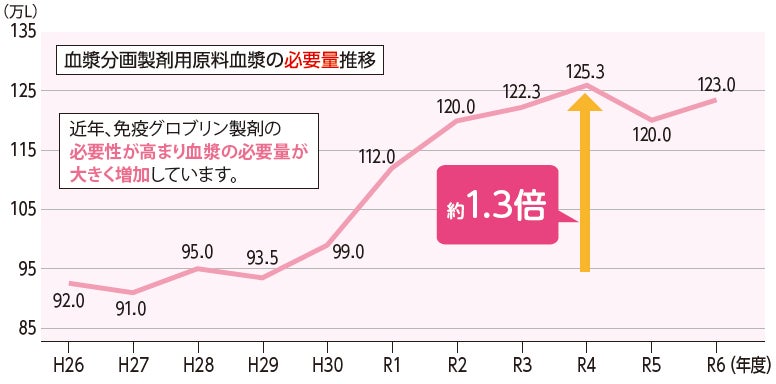 血漿分画製剤とは、血漿中に含まれる血液凝固因子、免疫グロブリン、アルブミンなどのたん白質を抽出・精製したものです。免疫グロブリン製剤をはじめとする血漿分画製剤は、自己免疫性疾患や難治性神経疾患の治療など医療に欠くことのできない製剤で、近年、医療需要が増加傾向にあります。
