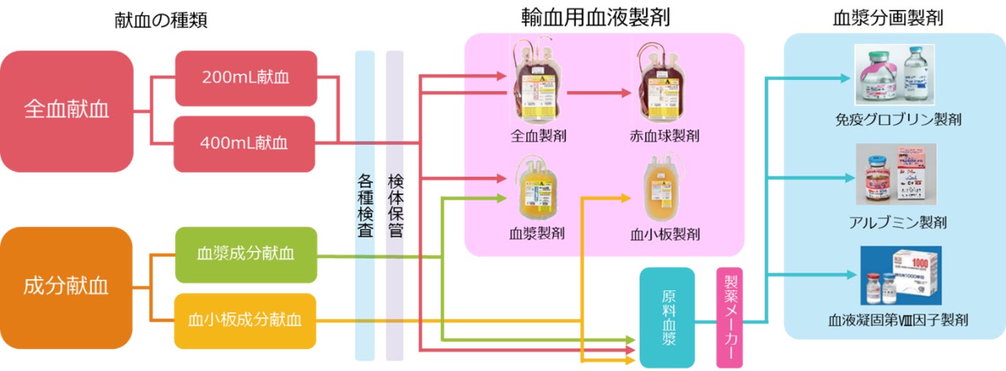 血漿分画製剤の製造には、全血献血および成分献血それぞれから生成される同製剤用原料血漿が必要となります。この原料血漿の必要量は同製剤の需要増加に伴い増加傾向にあるため、日本赤十字社では、血漿成分献血専用の献血ルームを東京・愛知・大阪の3か所に設置し、更なる原料血漿の確保に努めています。