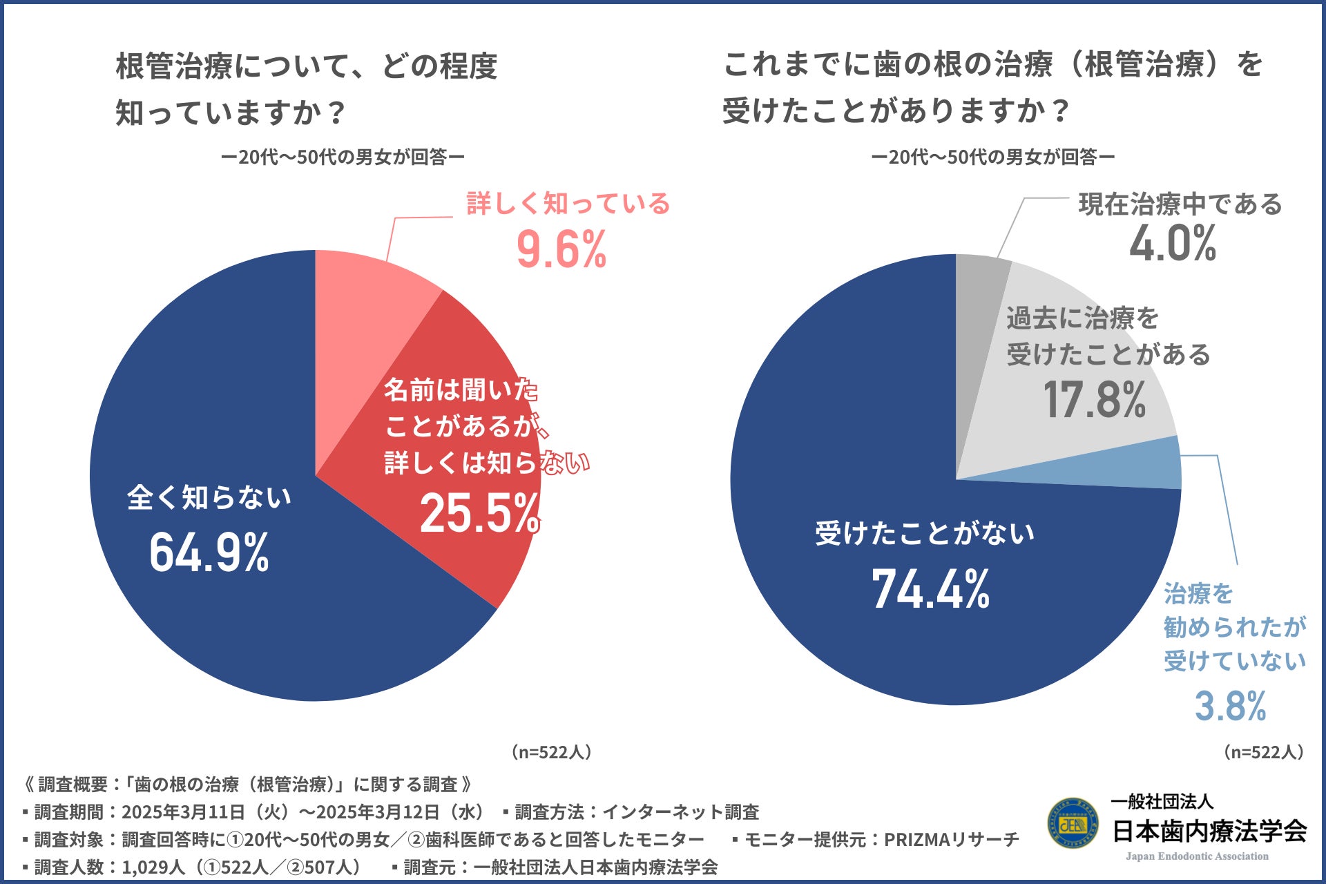 そこで今回、一般社団法人日本歯内療法学会(https://jea-endo.or.jp/)は、①20代〜50代の男女/②歯科医師を対象に「歯の根の治療(根管治療)」に関する調査を実施しました。
