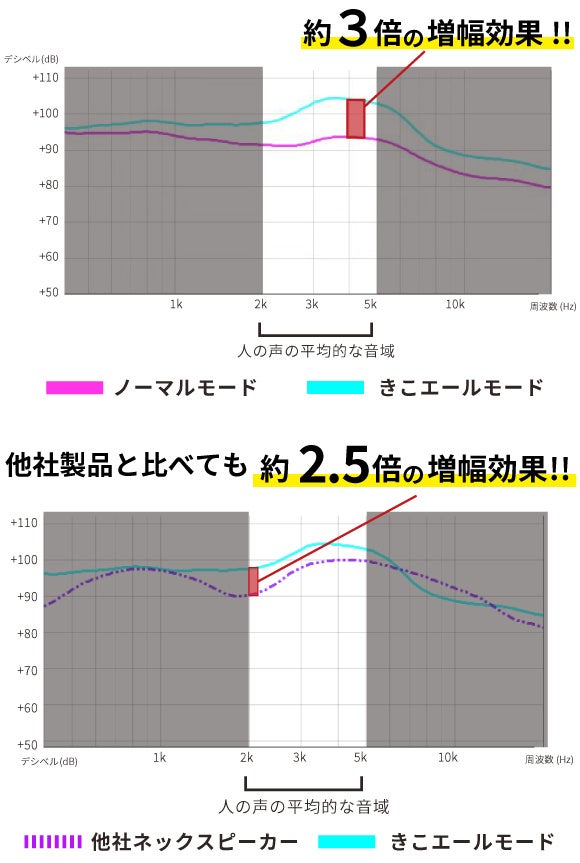 加齢性難聴で聞こえづらくなることが多い3000〜5000Hz帯域の高音域を重点的に増幅します。高音域が聞こえづらくなると、特に高周波ノイズ成分が強い歯擦音の「サ行」、破裂音の「サ行」・「タ行」などの「子音」が聞こえづらくなります。きこエールモードは、高音域の聞こえをカバーし、人の声を聞き取りやすくします。
